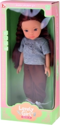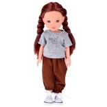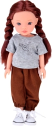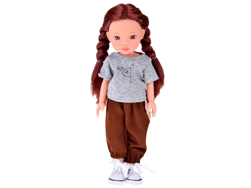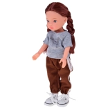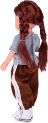 Dukken er ca. 33 cm høj, fremstillet af kvalitetsplast, og takket være artikulerede arme, ben og hoved kan hun let poseres. De lange, fyldige satinhår indbyder til at blive redt, flettet og stylet. En afslappet grå T-shirt med print, brune joggingbukser med hvide striber og hvide sneakers fuldender det moderne sportslook.
