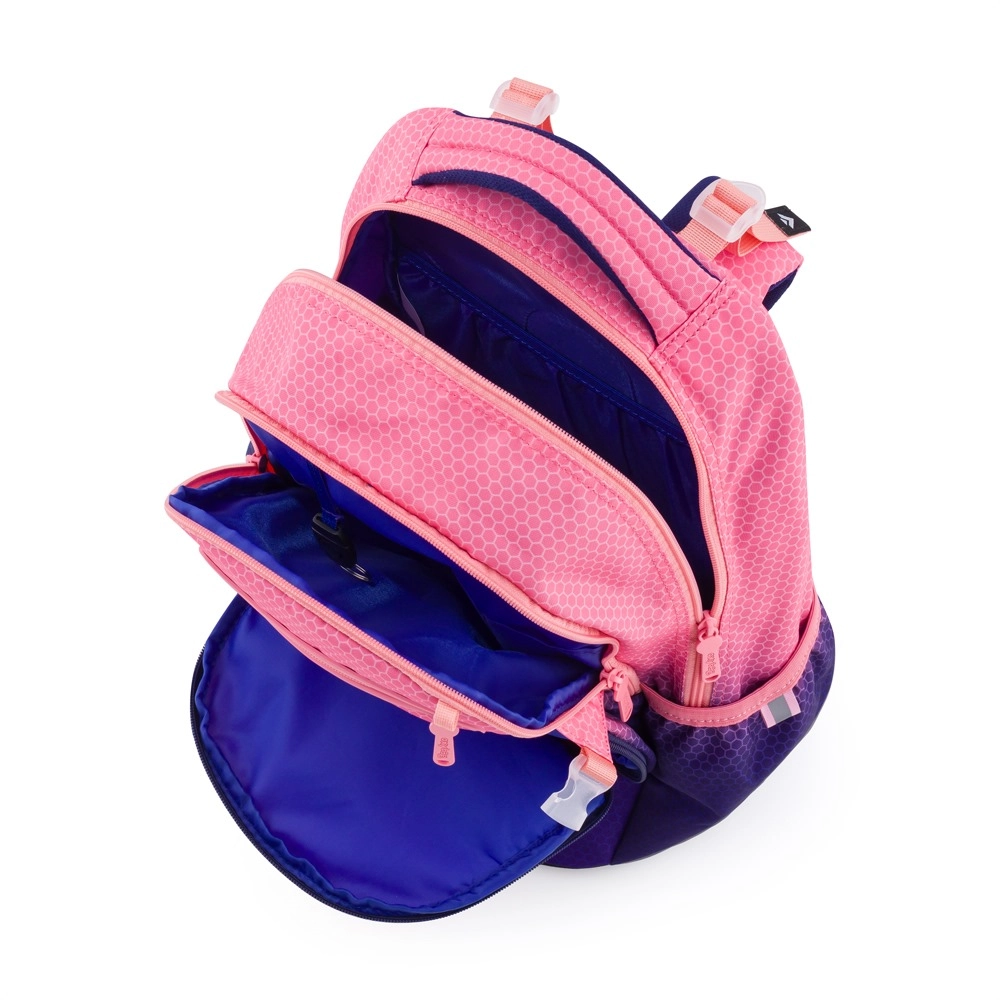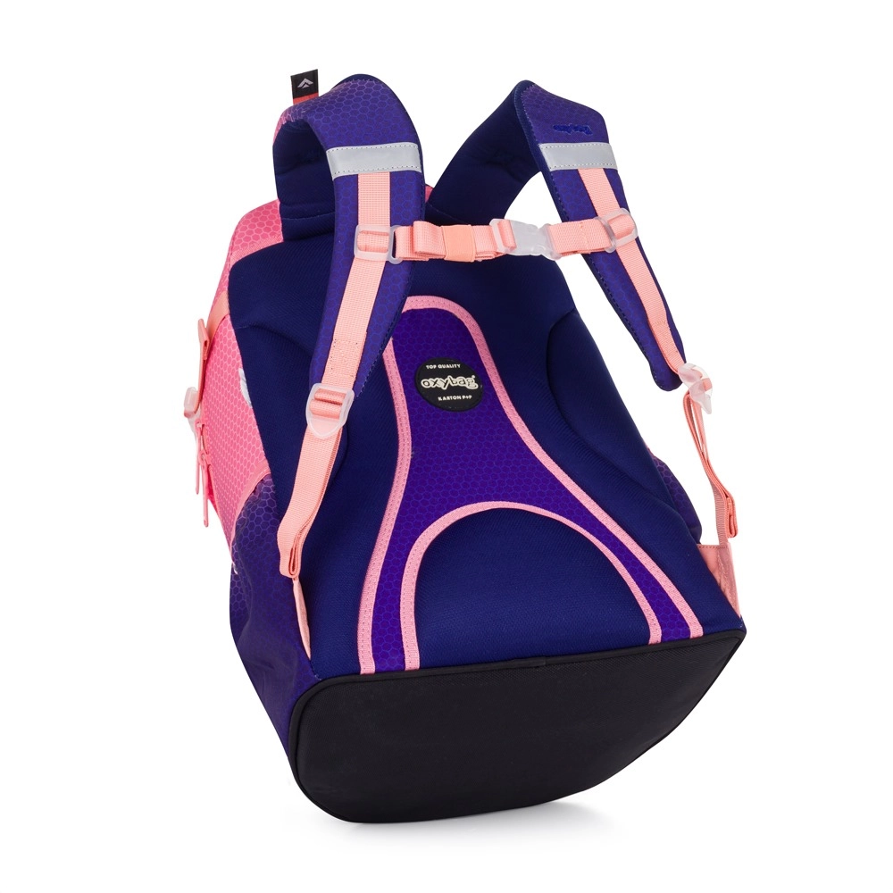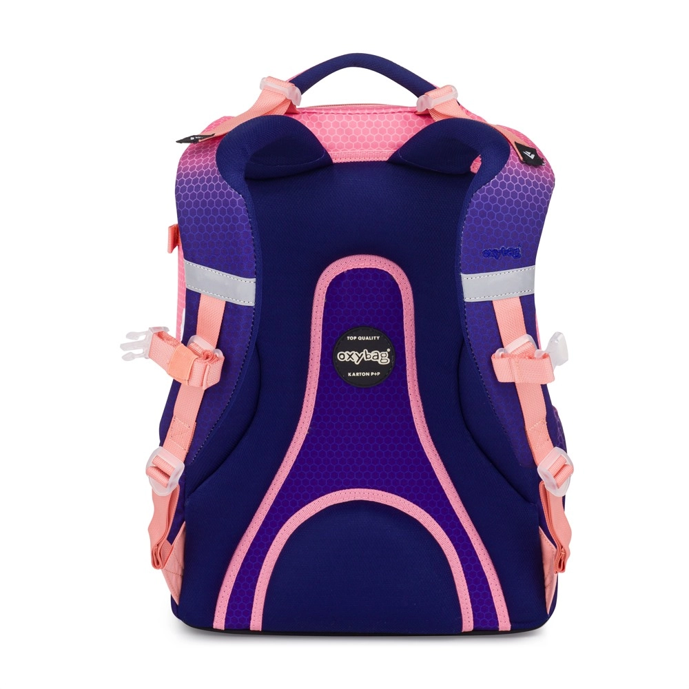 OXY Ombre Apricot er en stilfuld skolerygsæk med glidende farveovergang, der fanger blikket og samtidig opfylder kravene til sund og sikker bæring af skoleartikler. Den anatomisk formede rygpanel, bløde polstrede skulderstropper og justerbar brystrem fordeler vægten og støtter korrekt kropsholdning.
