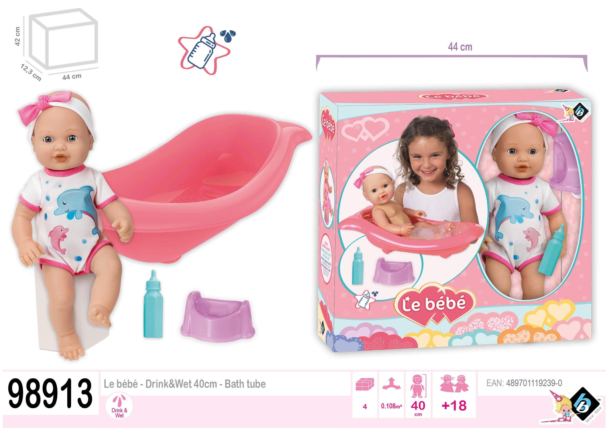 Det lille badekar på 41 cm giver rigelig plads til badningsritualer. Efter at have drukket fra flasken kan dukken sættes på potten for at efterligne rigtig tissetår, hvilket giver børn en autentisk oplevelse og lærer dem grundlæggende hygiejne gennem leg.