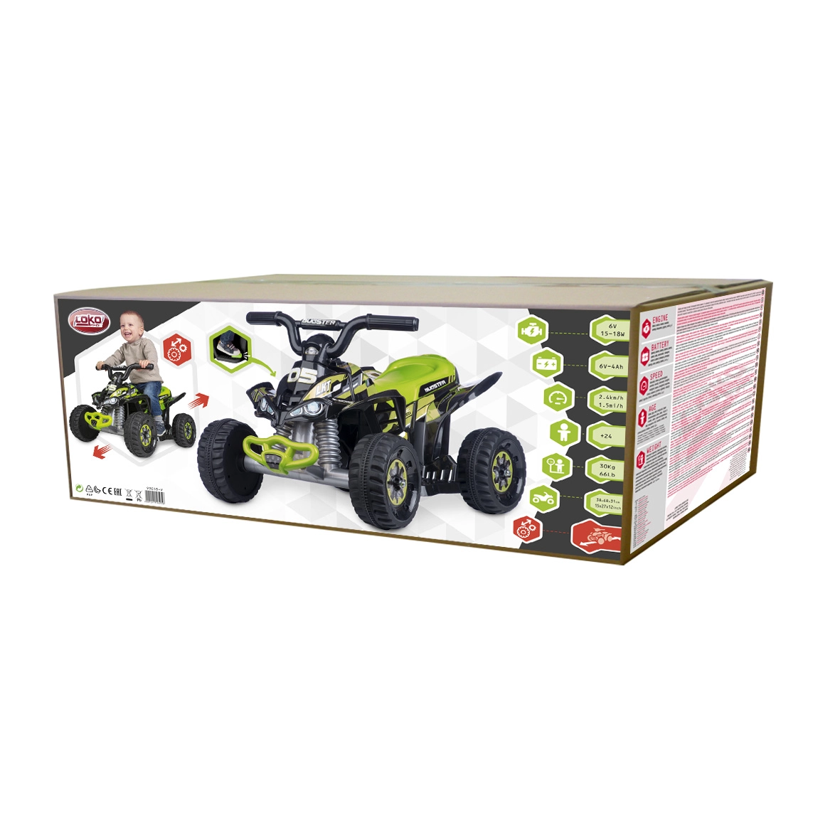 Denne kompakte elektriske ATV er et godt valg til de første køreture. Med målene 46 × 72 × 46 cm er den let at betjene og designet til at give børn en sikker og fornøjelig køreoplevelse. Takket være de robuste hjul og behagelige fodstøtter kan små chauffører føle sig trygge på forskellige underlag.