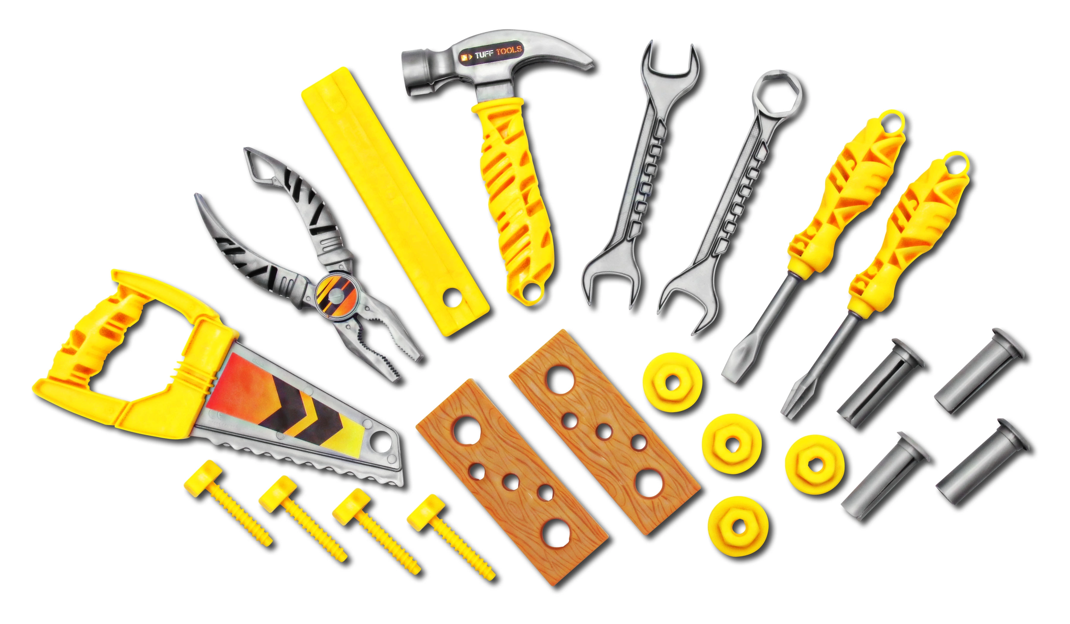 Hammer, tang, skruetrækkere og nøgler i børnestørrelse understøtter finmotorik og hånd–øje-koordination.