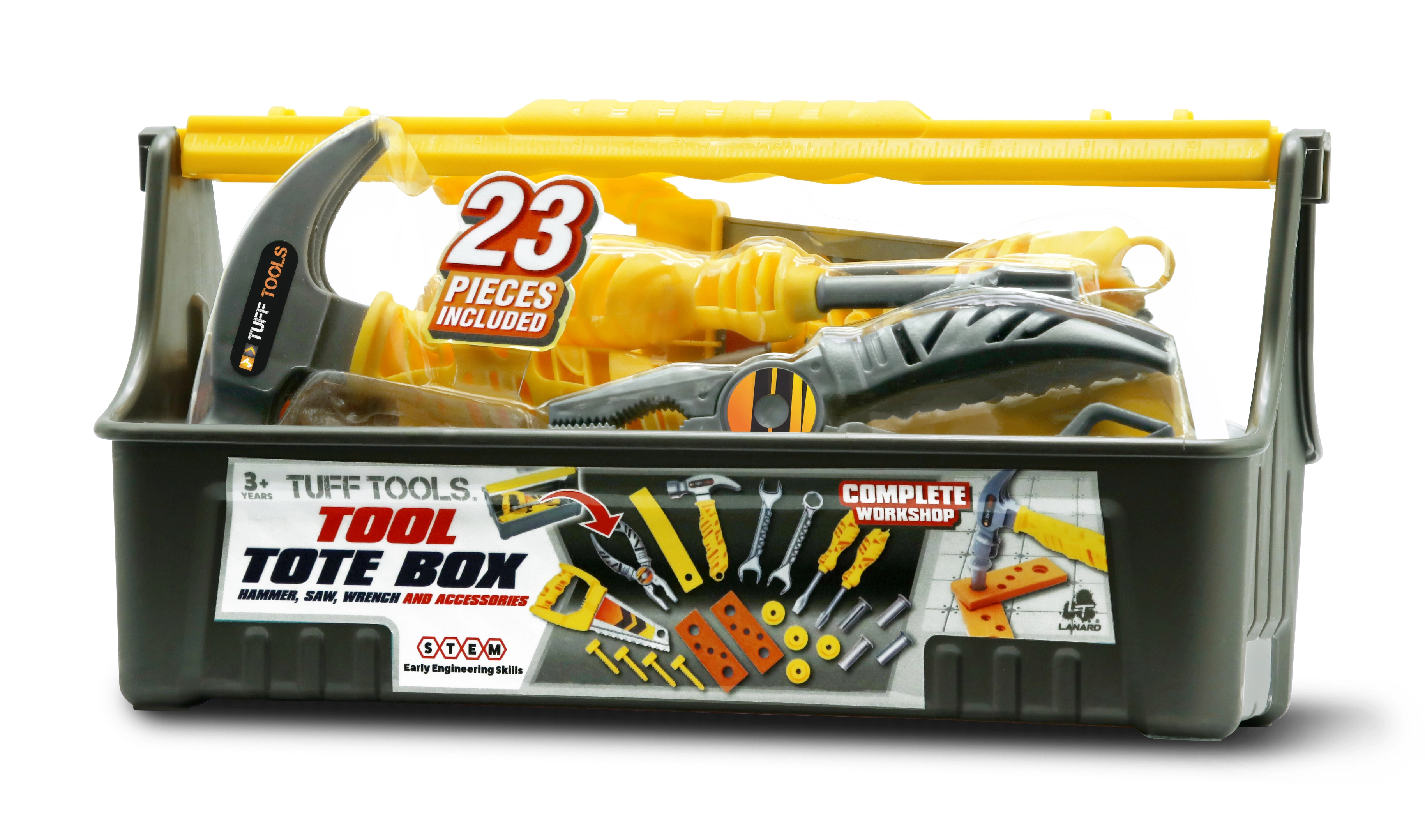 Opbevar alt i den robuste boks med håndtag og tag dit værksted med overalt. Et sæt med 23 dele til endeløs leg og læring.