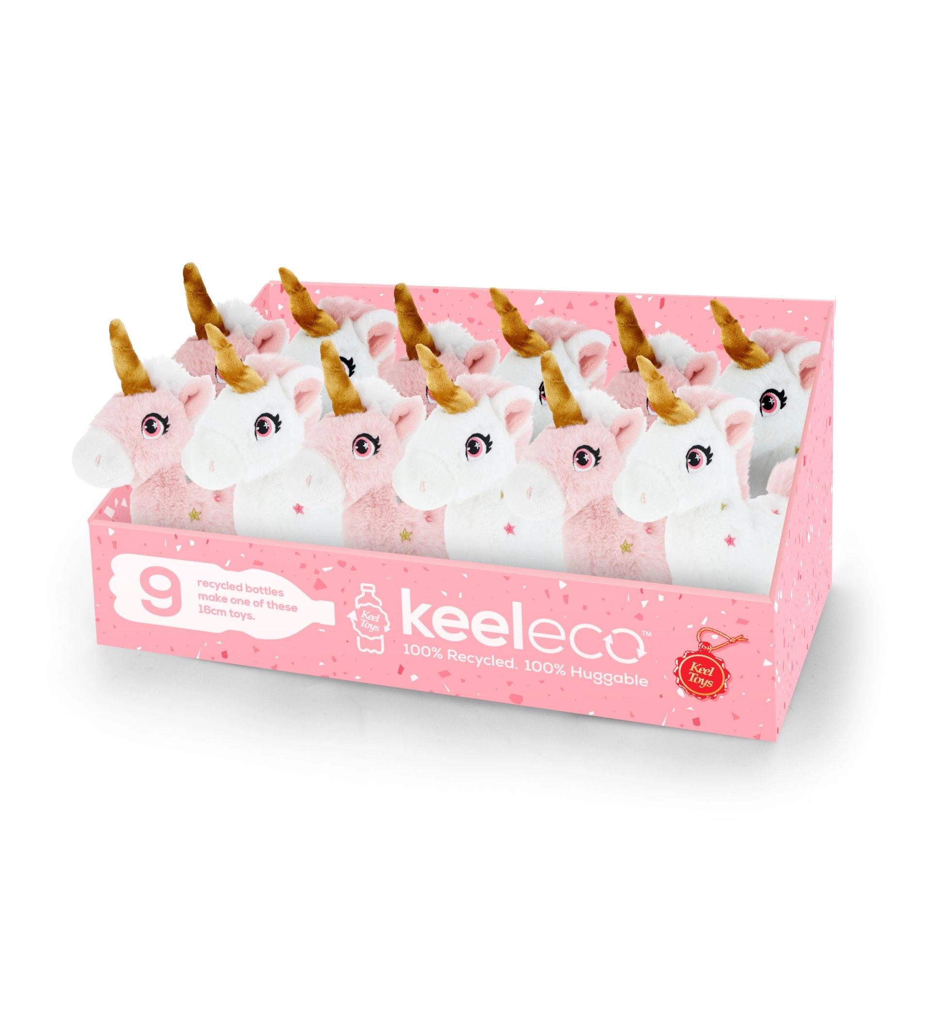 Den søde lyserøde enhjørning fra KEELECO-kollektionen fra KEEL TOYS er lavet af 100% genanvendt plast. Den bløde plys, store strålende øjne og venlige udtryk gør den til en ideel gave til både børn og tilhængere af bæredygtige legetøj. Den kompakte størrelse på 16 cm passer perfekt i hånden og glæder både hjemme og på farten.