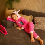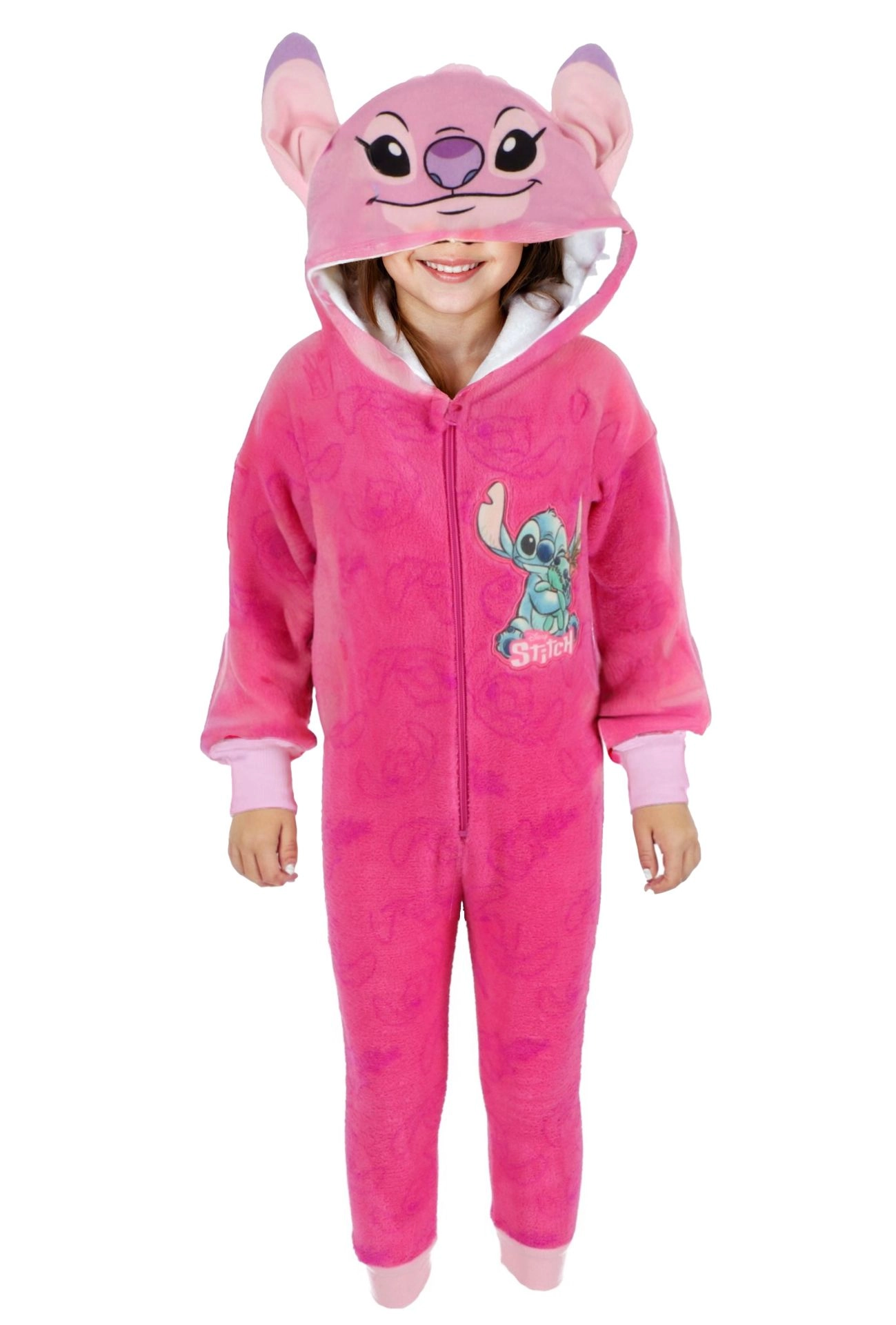 Den praktiske lynlås kan selv de mindste klare, mens ribkanter ved ankler og håndled holder ærmer og ben på plads. Hætten med 3D-ører og STITCH-print giver dragten et legende udtryk – perfekt til fotos, fester og udklædning.