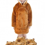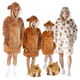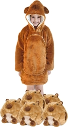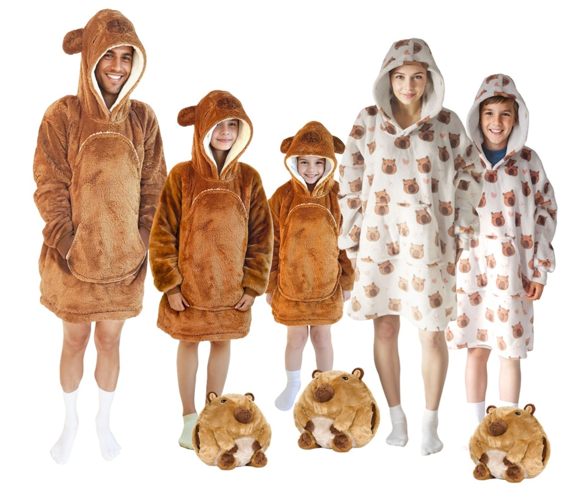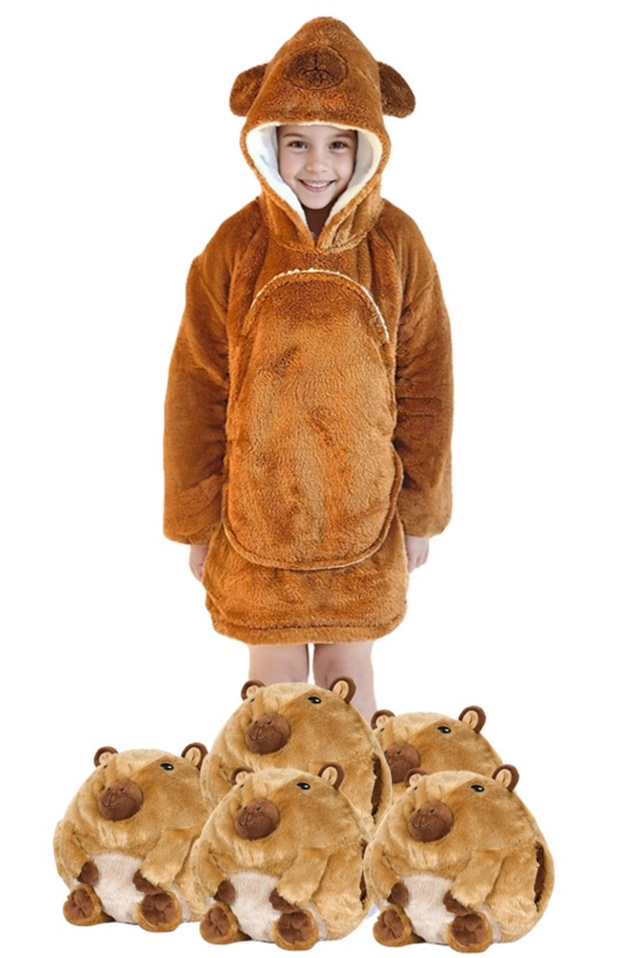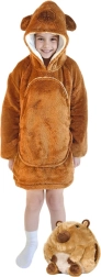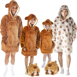 Denne børne-hættetrøje-plette i kapybara-design føles som et kram, der varmer fra top til tå. Den indvendige sherpa-fleece er luftig og varm, mens ydersiden i blød flannel er silkeblød at røre ved. Takket være den oversize pasform føler børn sig godt tilpas, uanset om de ser TV, leger eller slapper af.