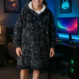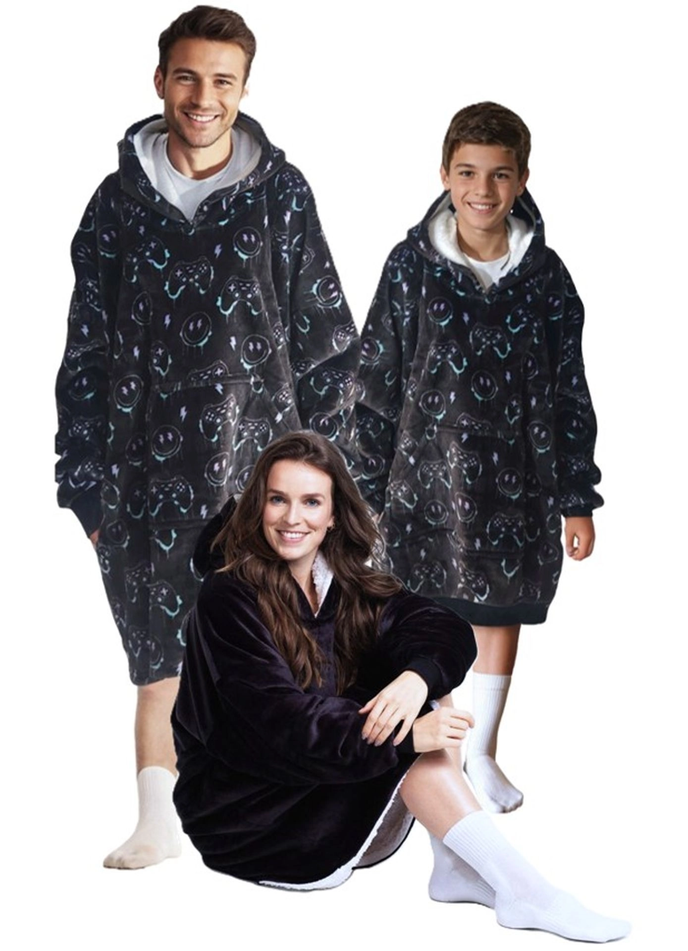 Børnenes hættetrøje-tæppe kombinerer komforten fra et tæppe med praktikken fra en hoodie til børn 7–12 år. Det byder på superblød fløjl-flannel udenpå og luftig sherpa-fleece indeni for maksimal varme og komfort. Med kæmpe frontlomme og stor hætte er den ideel til sofahygge, gaming og camping. Det stilfulde gaming-print vil glæde enhver lille gamer.