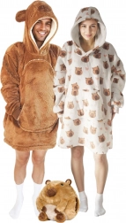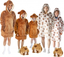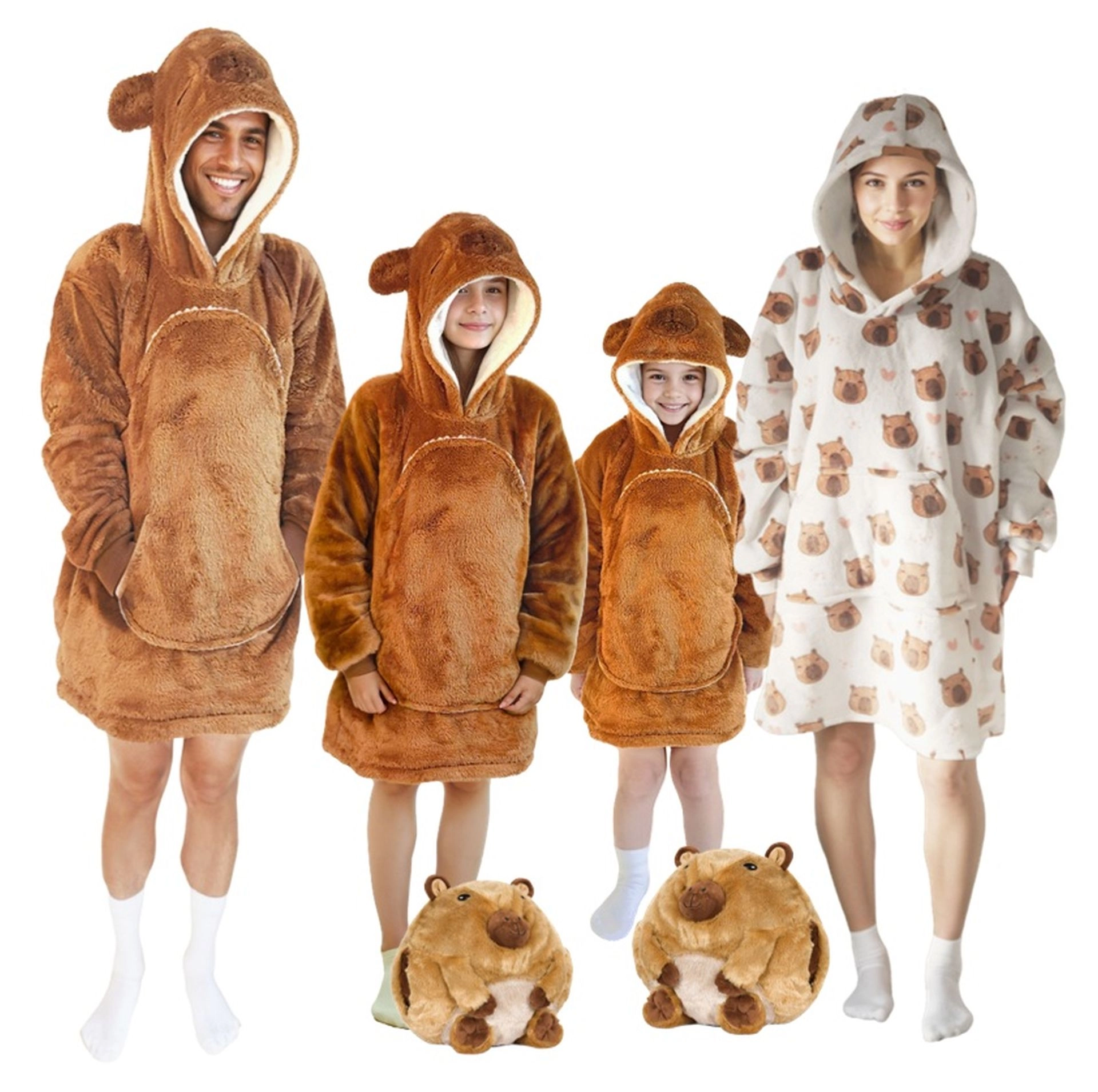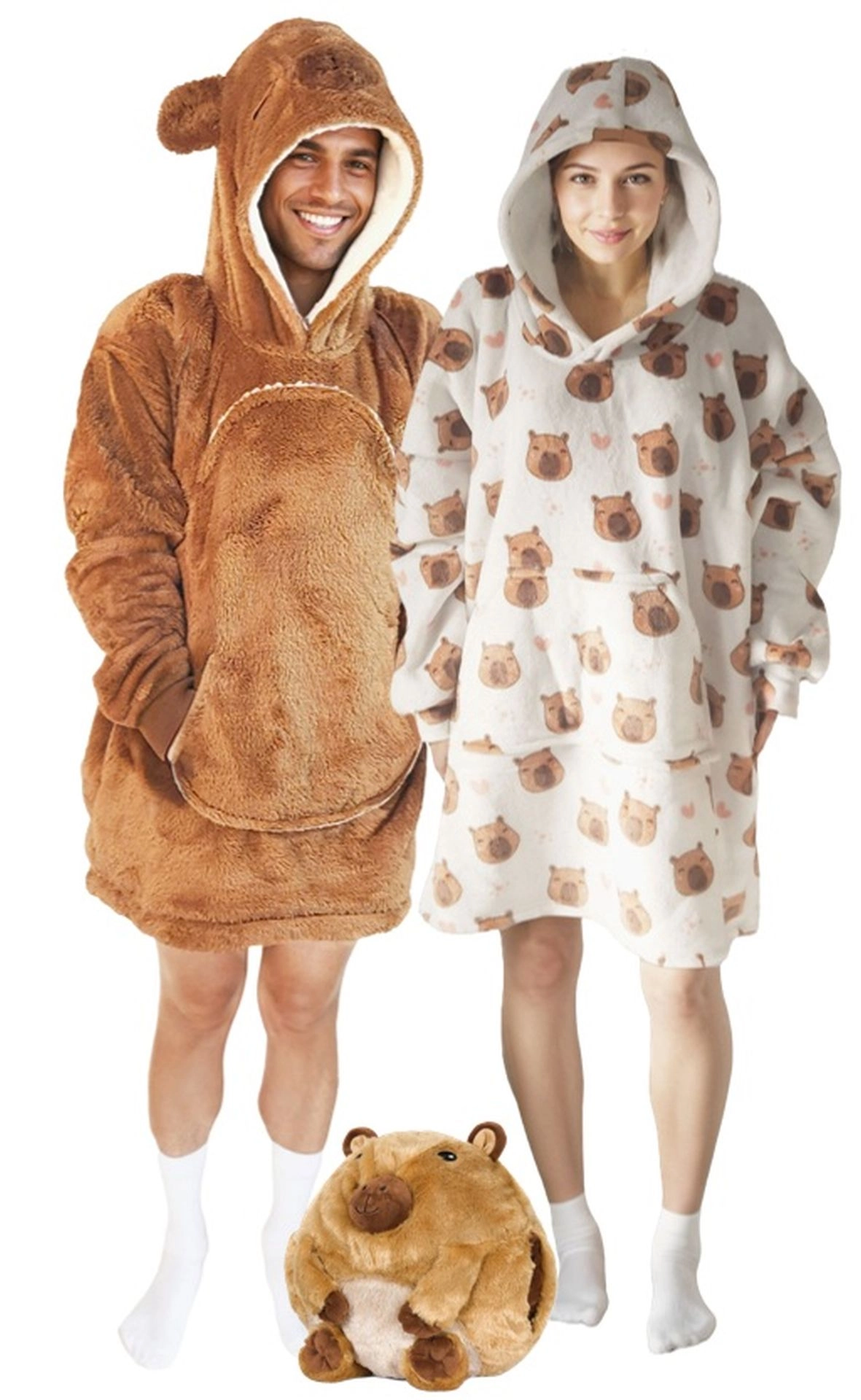 Dette COZY NOXXIEZ hoodie-tæppe med kapybara-motiv er perfekt til sofahygge, læsning, PC-arbejde, camping og hygge i haven i køligere vejr. Den oversize pasform begrænser ikke bevægelsen og varmer fra skuldre til knæ. Det er en fantastisk gave til både kvinder og mænd, som kombinerer humoristisk design med reel funktionalitet.