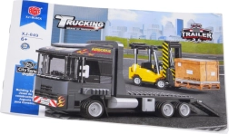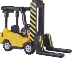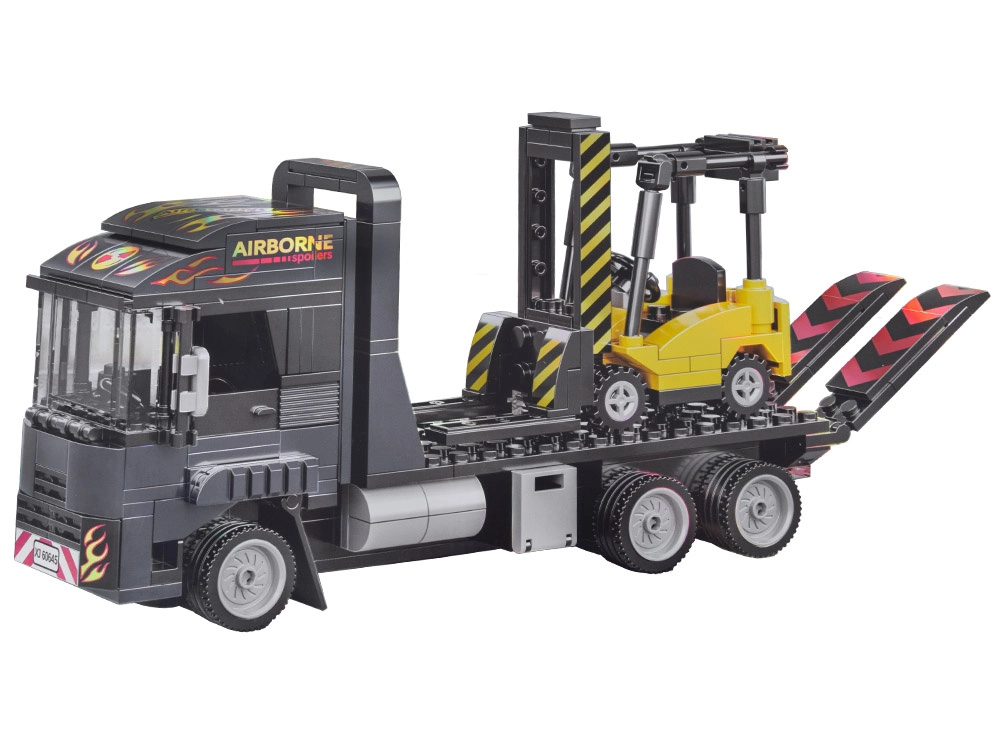 Dette tekniske byggesæt bringer transportens og logistikkens verden ind på børneværelset. Byg en trækker med platform og klapramper, last gaffeltrucken op på ladet og begiv jer “ud på vejen”. Den realistiske farvepalet i mørkeblå, grå og gul samt de medfølgende klistermærker giver modellerne et autentisk udtryk af arbejdsmaskiner.