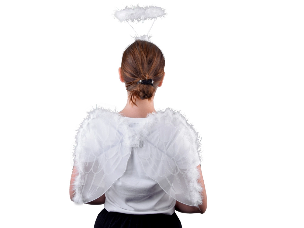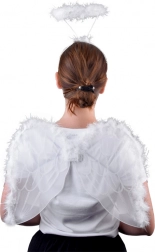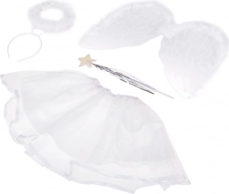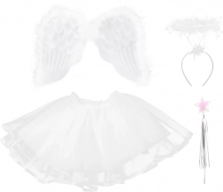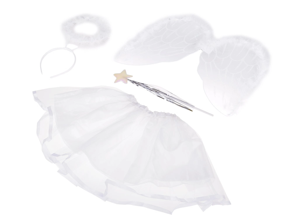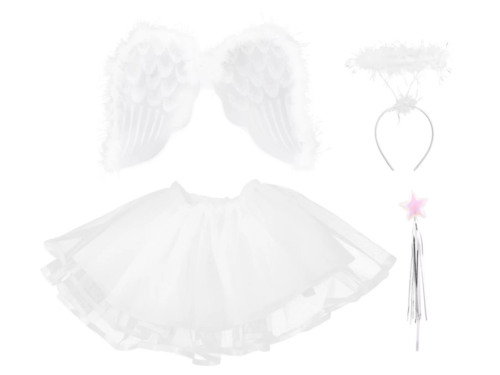 Forvandl dit barn til en sød lille engel med dette komplette kostume. Sættet indeholder hvide fjerbesatte vinger, en blød glorie på hårbøjle, et luftigt tutuskørt med elastisk talje og en stjernetryllestav. Let, behageligt og ideelt til skoleoptrædener, shows, fastelavn, fotoshoots og leg derhjemme.