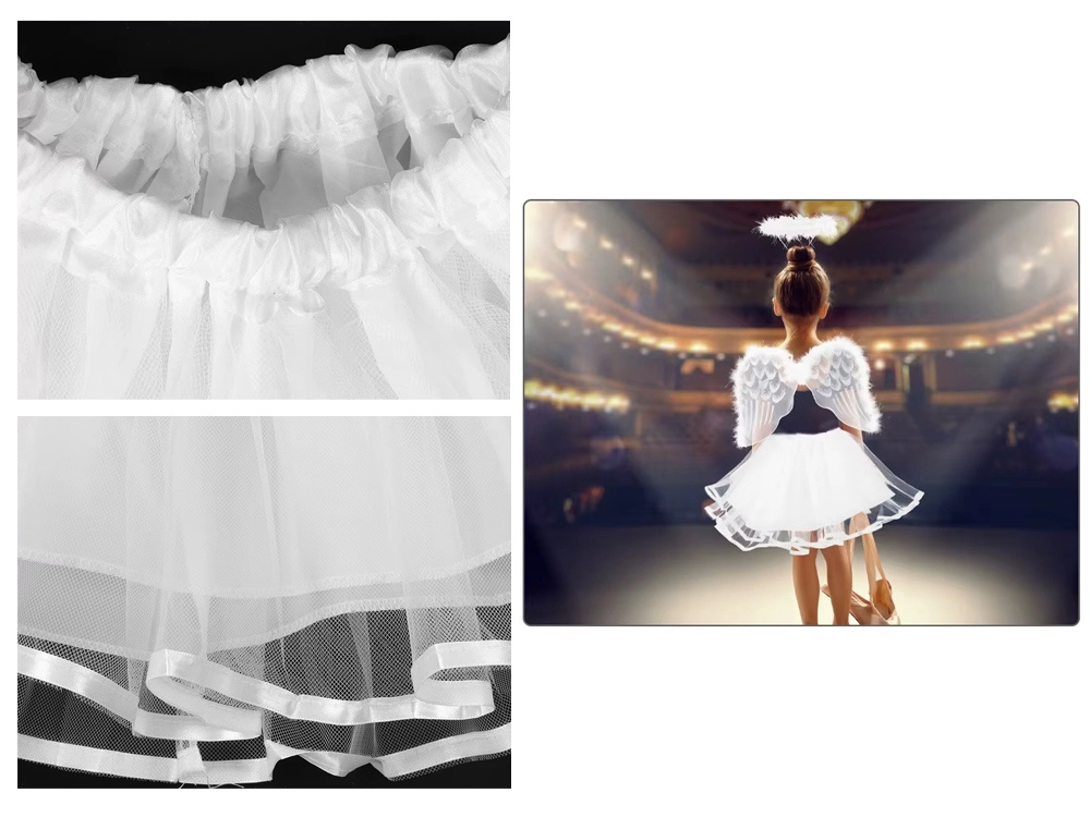 Det lagdelte tylskørt er let og åndbart. Den elastiske talje tilpasser sig nemt – ca. 18–30 cm i omkreds, skørtlængde ca. 32 cm. Perfekt til fri bevægelse og heldagskomfort.
