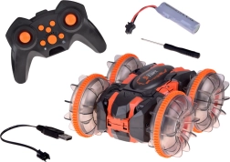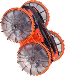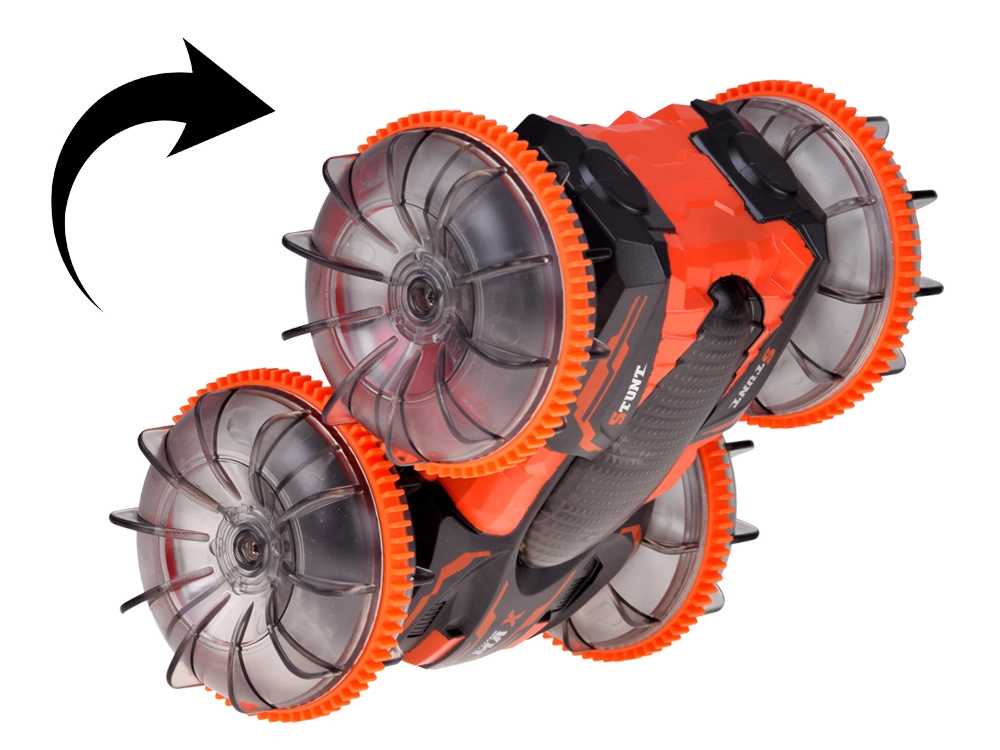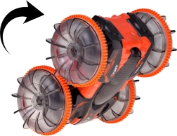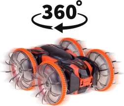 Oplev actionfyldt kørsel med den amfibiske stunt RC-bil, der klarer græs, sand, fliser og vandoverfladen. Store gennemsigtige hjul med markant mønster og LED-belysning giver hver tur et show og sikkert vejgreb. Med 360° rotationer fortsætter bilen med at køre, selv når den vender om på den anden side.