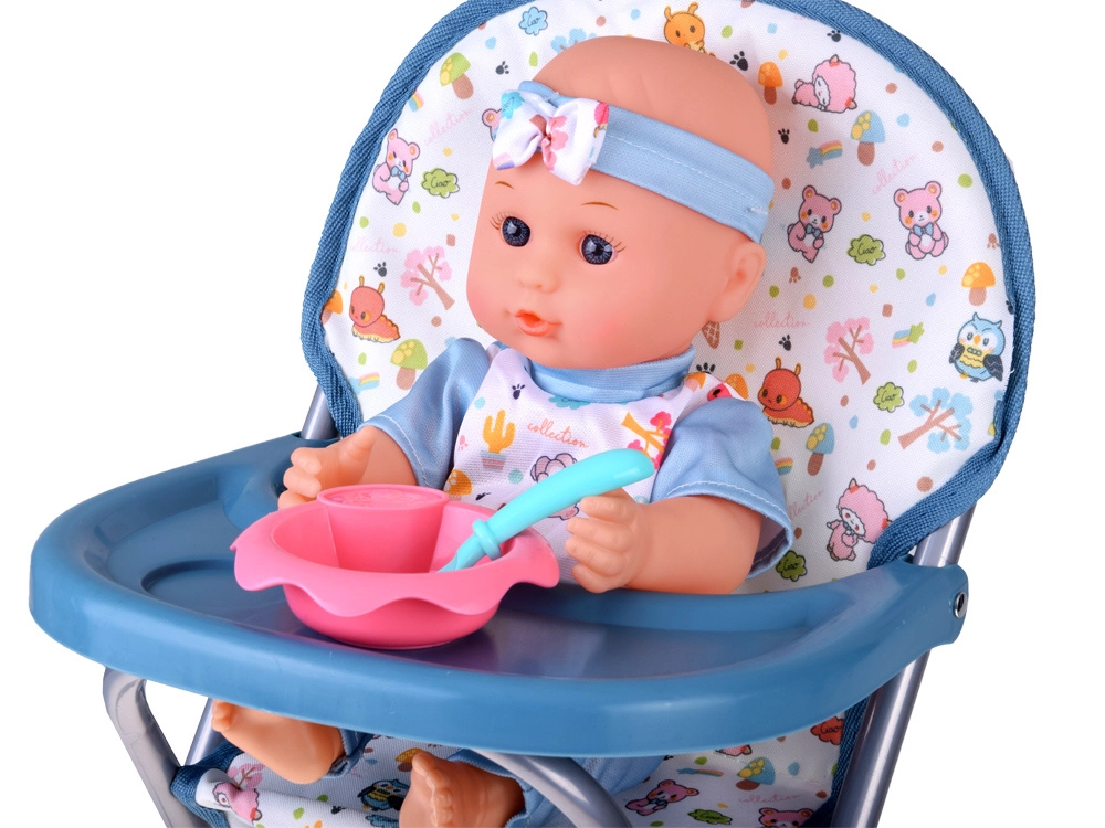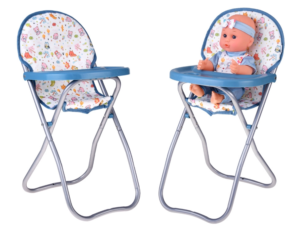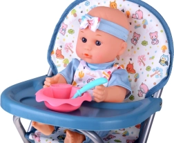 Stabil sammenklappelig højstol med bakke og plads til skål og bestik. Understøtter realistisk leg med fodring og måltider sammen med dukken.