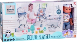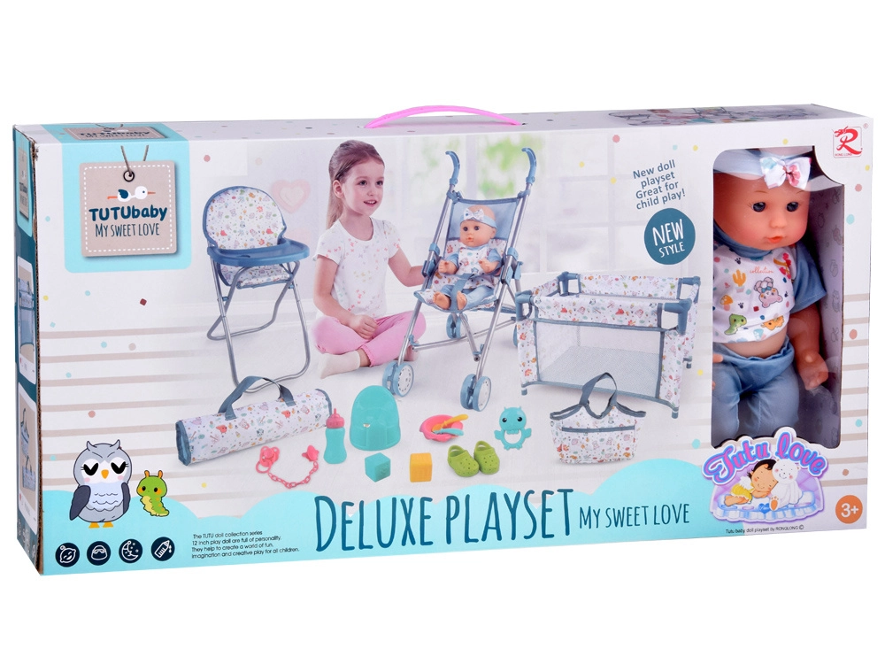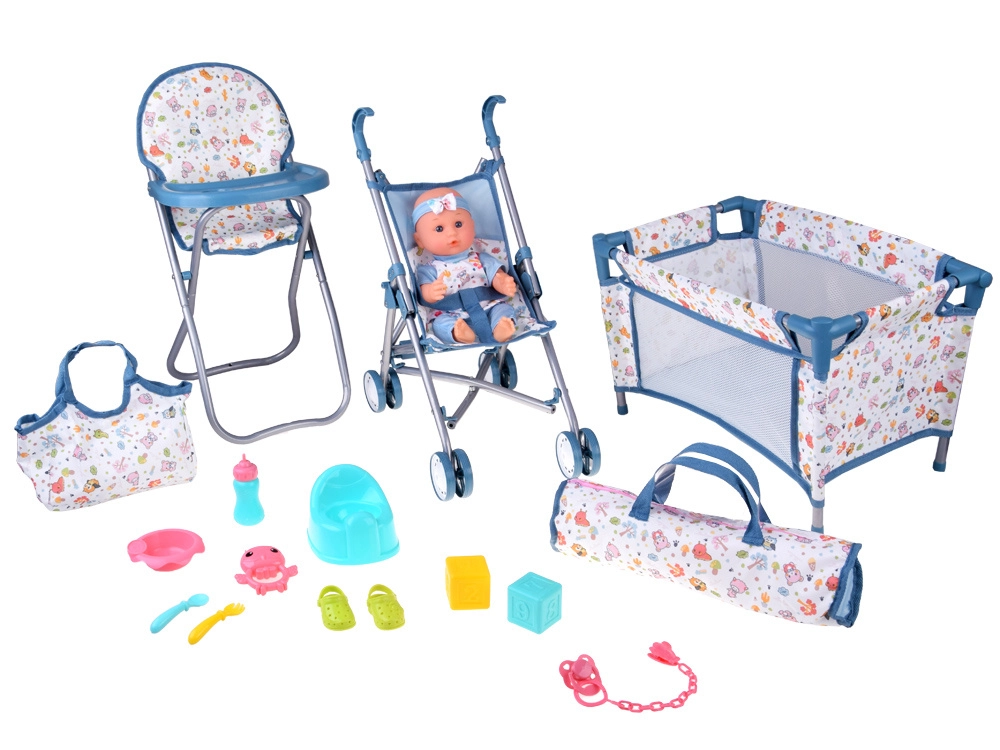 - Sæt til dukke – babydukke med klapvogn, rejseseng, højstol og tilbehør