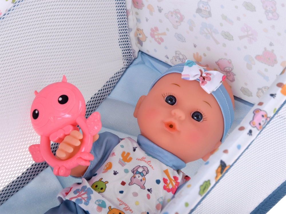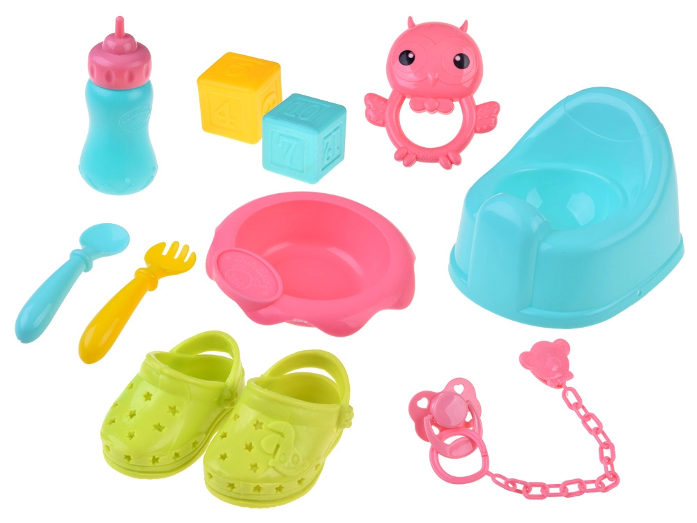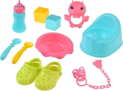 Det praktiske tilbehør omfatter et spisesæt (skål, bestik og flaske), potte, sut med kæde, farvede klodser og en rangle. Rejsesengen med åndbare netsider og taske er ideel til leg og opbevaring. Med det rige tilbehør kan børn let efterligne virkelig babypleje og udvikle både kommunikation og finmotorik.