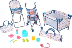 Komplet legesæt til små omsorgsgivere: en sød babydukke med rigt tilbehør til fodring, bleskift, søvn og gåture. Sættet indeholder en sammenklappelig klapvogn, højstol, rejseseng med taske, potte, flaske, skål med ske og gaffel, sut på kæde, legetøj og små sko. Dette sæt udvikler empati, kreativitet og rolleleg samt giver timevis af sjov hjemme og på farten.
