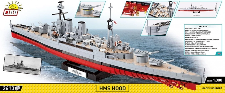 Den legendariske britiske slagkrydser HMS HOOD hørte til de mest berømte skibe i Royal Navy i mellemkrigs- og krigsårene. Dette præcise byggesæt i målestok 1:300 gengiver trofast silhuetten og bevæbningen på det berømte skib – fra den lange skrogform med rød vandlinje over den rigt udformede overbygning til de drejelige tårne på hovedbatteriet.