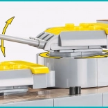Drejelige kanontårne med justerbare løb, bevægelige skruer og ror giver modellen dynamik og interaktivitet.