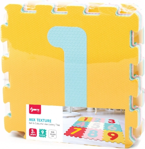 Praktisk sæt af bløde skumblokke med udtagelige tal til sikker leg og læring. Ni dele i størrelsen 32 × 32 cm danner en måtte, der dæmper stød, isolerer mod kulde og udvikler finmotorik samt talgenkendelse.