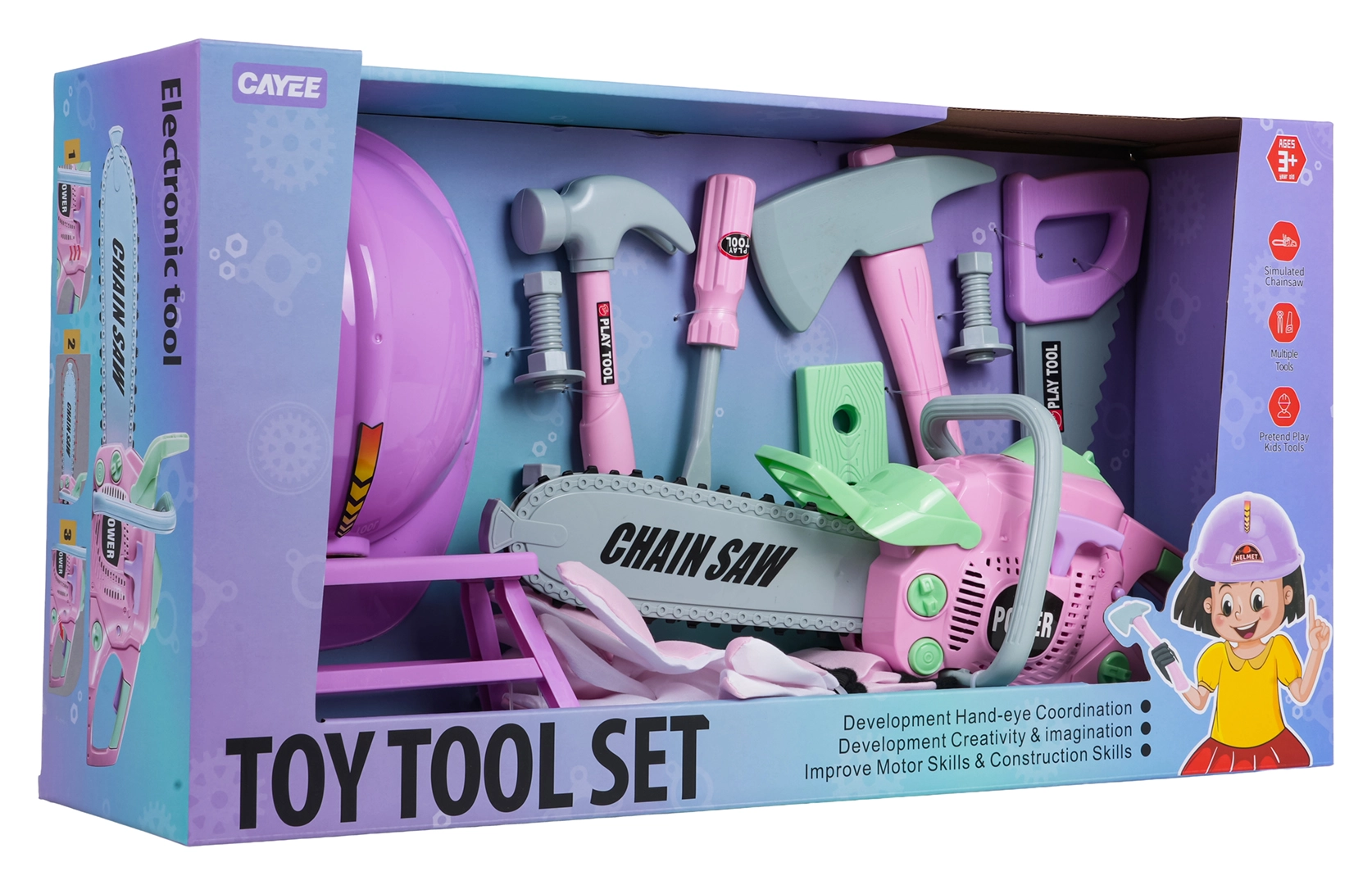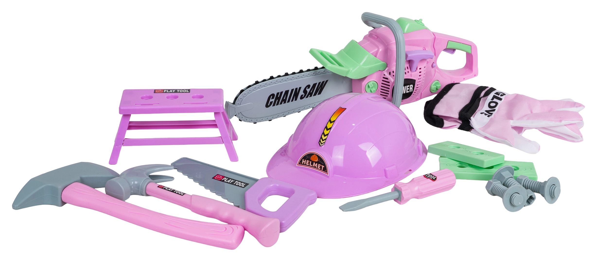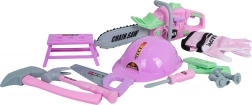 Legetøjs-rosa værktøjssæt til børn fra 3 år vil glæde små gør-det-selv-folk med sit rige indhold. Indeholder motorsav med lyde, beskyttelseshjelm og handsker, hammer, sav, skruetrækker, skruer samt bord – mini-arbejdsplads. Fremstillet af kvalitetsplast, sikkert og let for børnehænder.