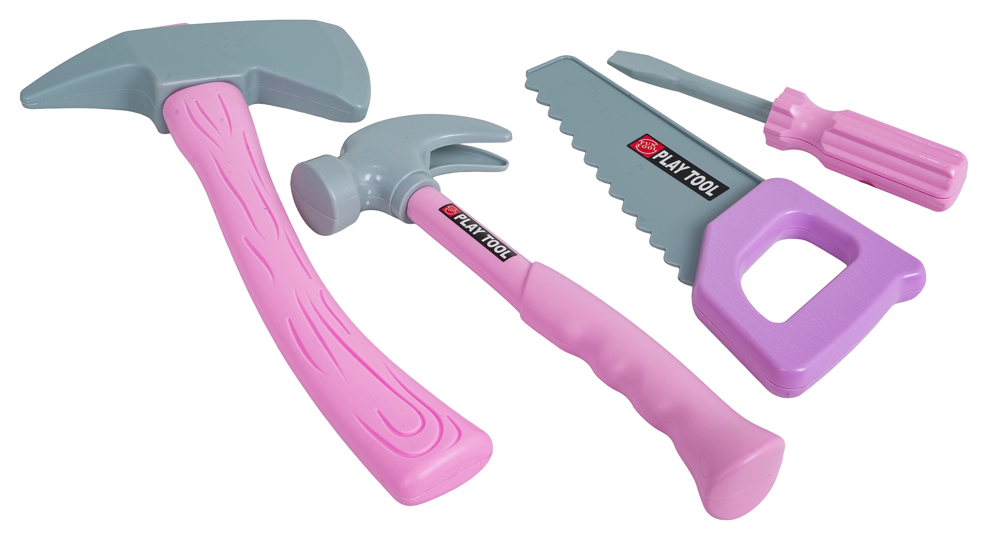Hammer, sav, skruetrækker, økse, skruer, møtrikker og bord – alt i let plast for nemt greb og håndtering for børn.