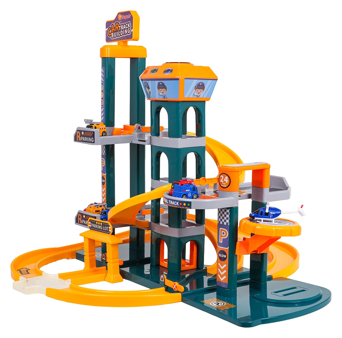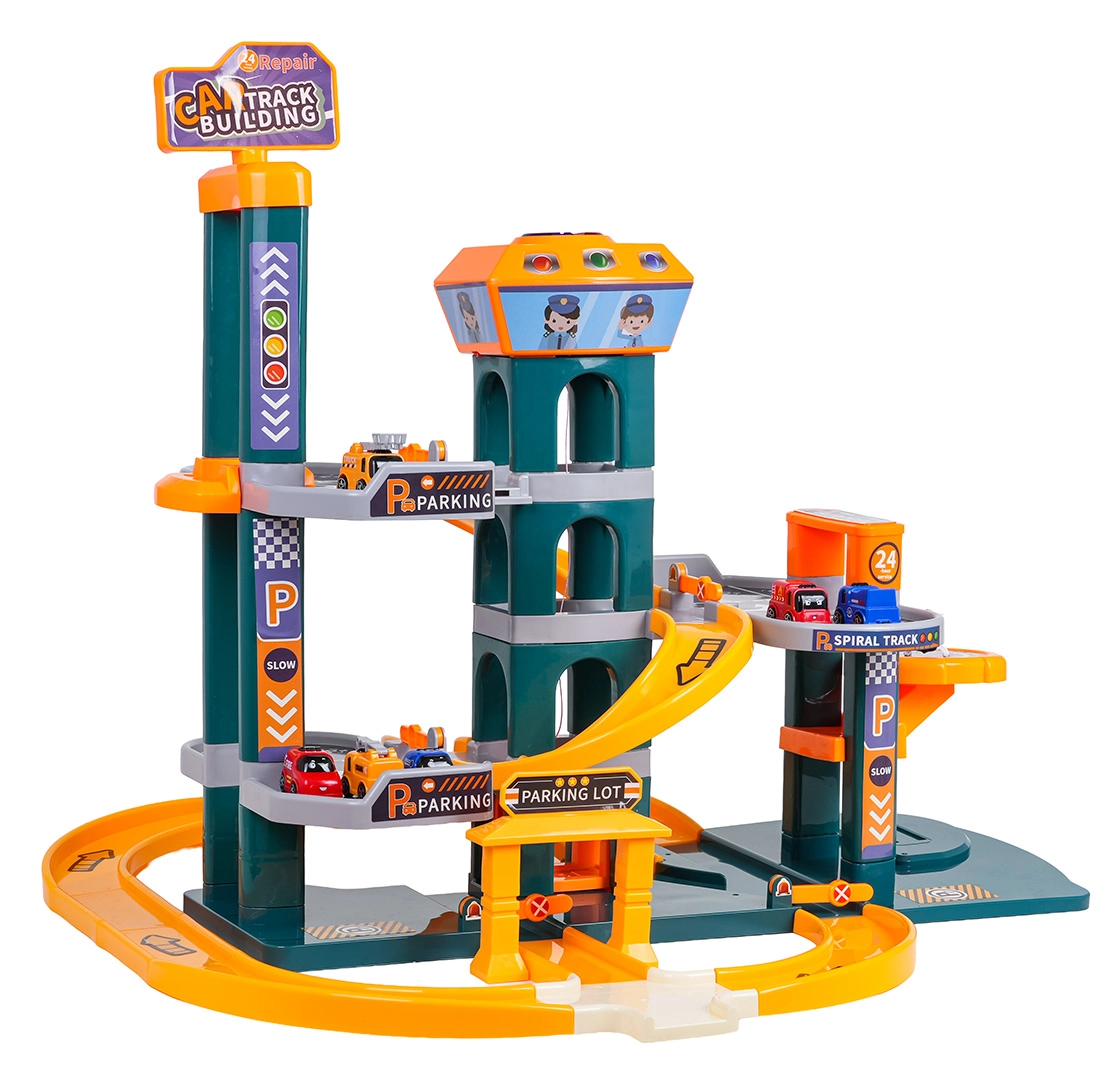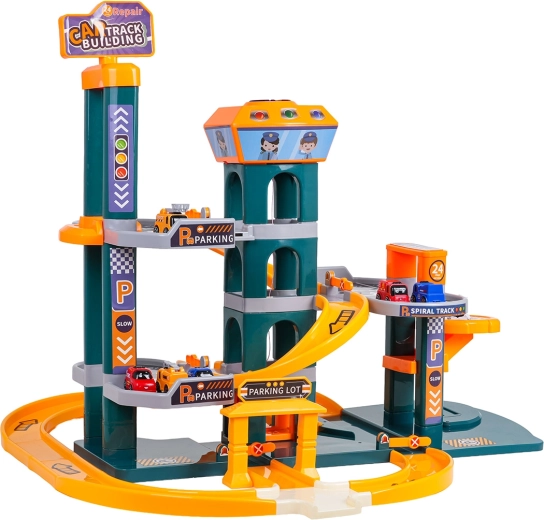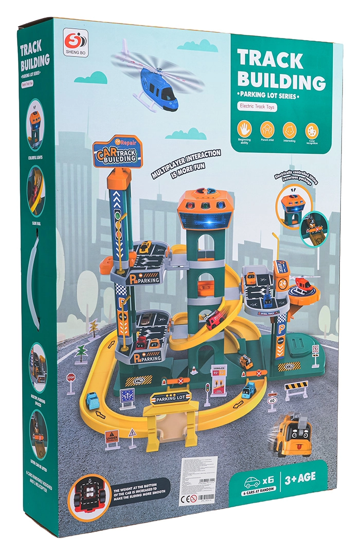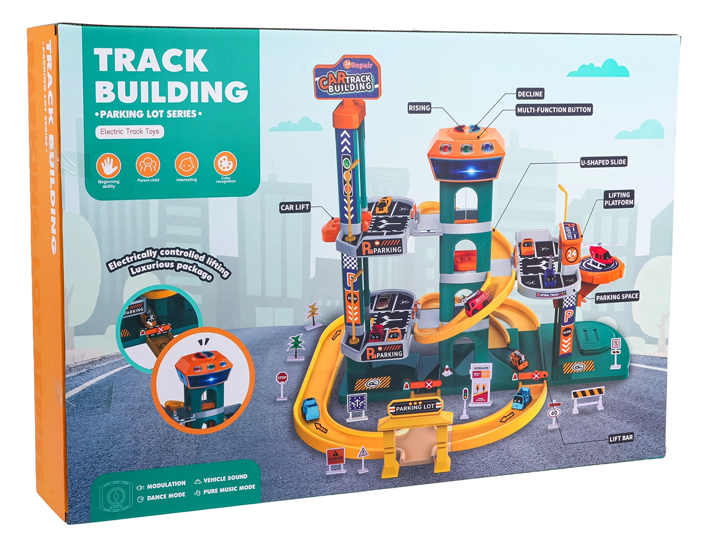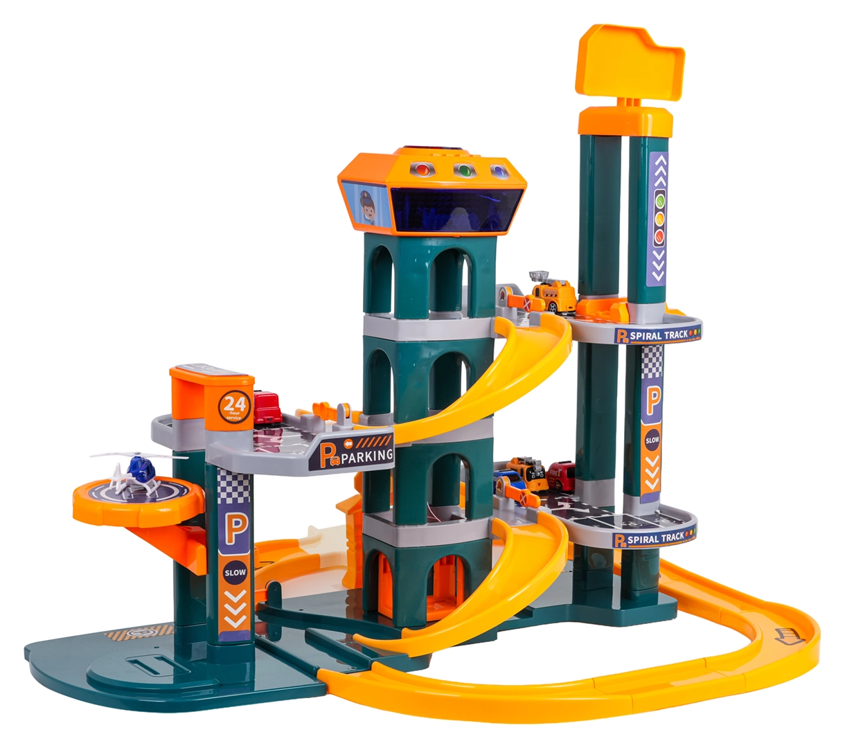 Forskellige ruter, nedkørsler og parkeringspladser understøtter kreativ leg og kapløb. Børn kan skifte mellem elevatoren og at suse ned ad den snoede bane.