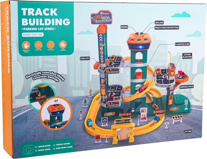 Dette rummelige blå parkeringshus glæder små chauffører med gennemtænkt layout og stabil konstruktion. Børn kan parkere på to niveauer, køre på ramper, suse ned ad spiralbanen og bruge den elektriske elevator, der drives af 3× AA (medfølger ikke). Kontrolpanelet på tårnets top giver interaktivitet med glade melodier, sirene- og køretøjslyde samt blinkende lyseffekter.