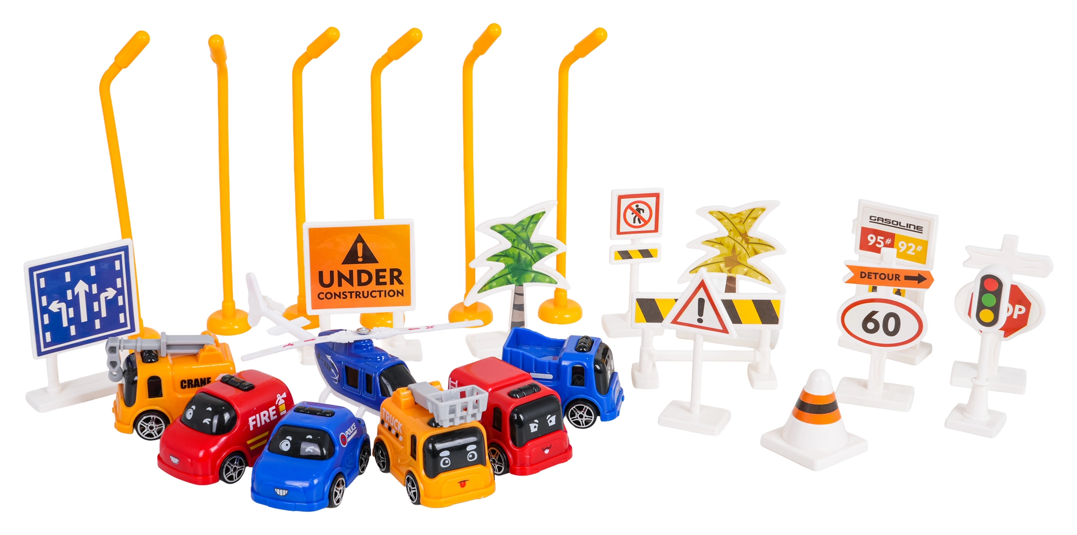 I sættet finder du minibiler (politi, brandvæsen, kraner), en helikopter, skilte, bomme og lamper – alt til realistiske trafikscener.