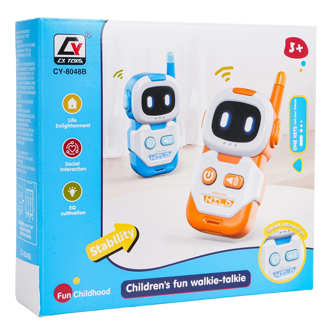 Sjovt sæt med to børne-walkie-talkier i robotstil til små opdagelsesrejsende fra 3 år. De er letvægts og kompakte, ligger godt i små hænder og tilbyder lang rækkevidde til leg både ude og inde. I pakken medfølger håndledsstropper for sikker bæring. Strømforsyning: 3× AA-batterier (pr. walkie-talkie), batterier medfølger ikke.