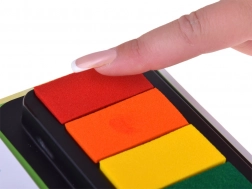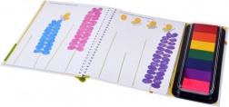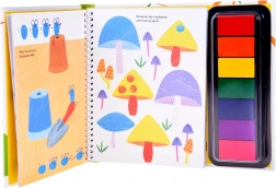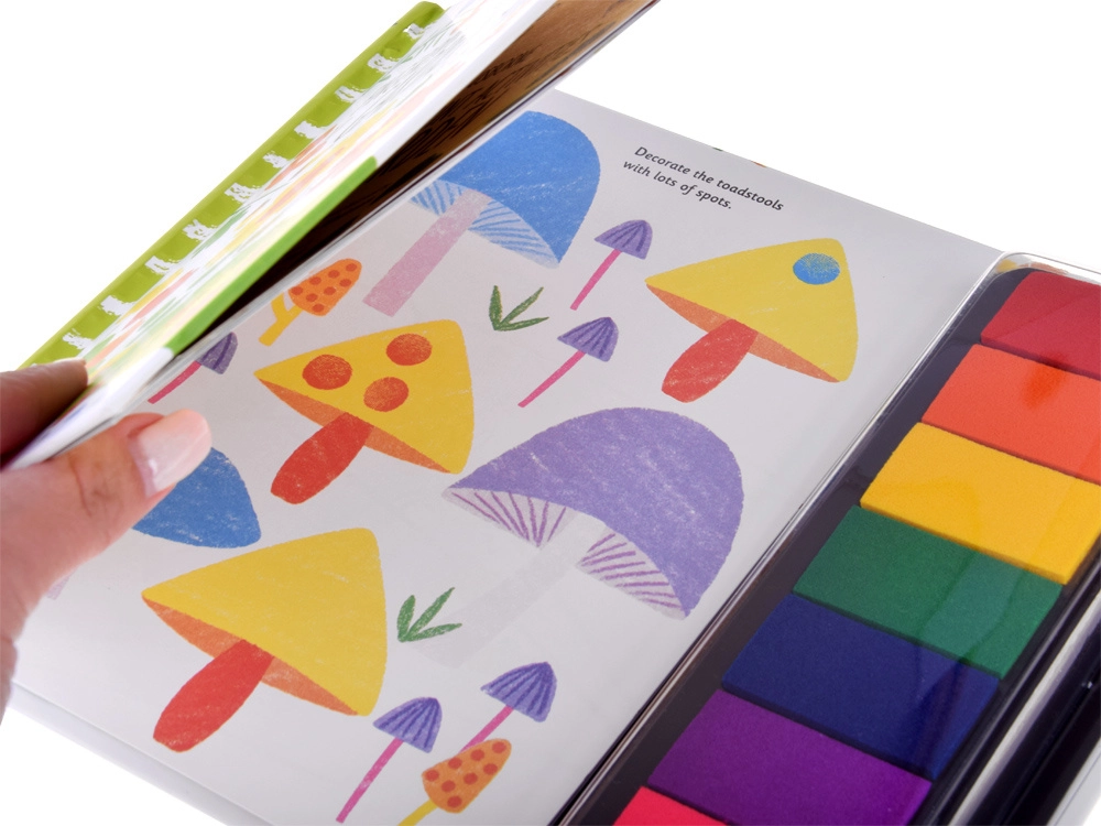 Den flerfarvede stempelpude er en del af bogen – dyp fingeren og skab farverige blomster, prikker og mønstre. Uden rod og uden behov for ekstra redskaber.