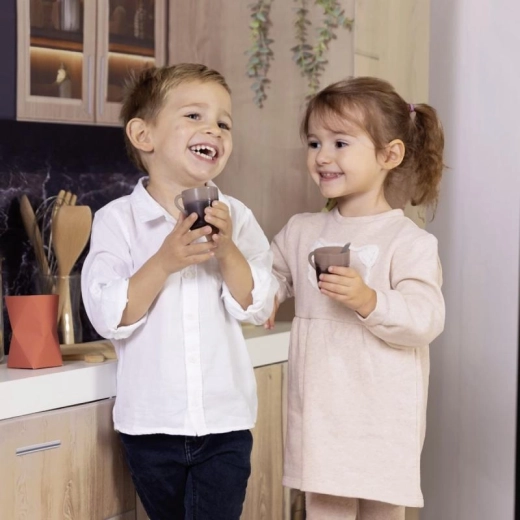 Det praktiske sæt inkluderer 2 krus, 2 skeer og 2 kaffekapsler, så børnene også kan servere for venner eller søskende. De kompakte mål 16,5 × 21 × 21,5 cm sikrer, at maskinen passer på enhver lille køkkenbordplade.