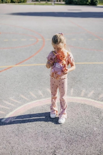 Sidelukning og en solid frontlomme holder dukken stabilt på plads, også når man er i bevægelse.