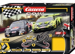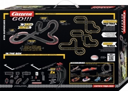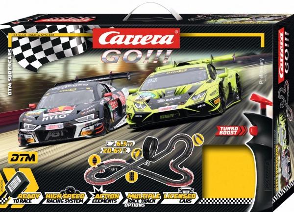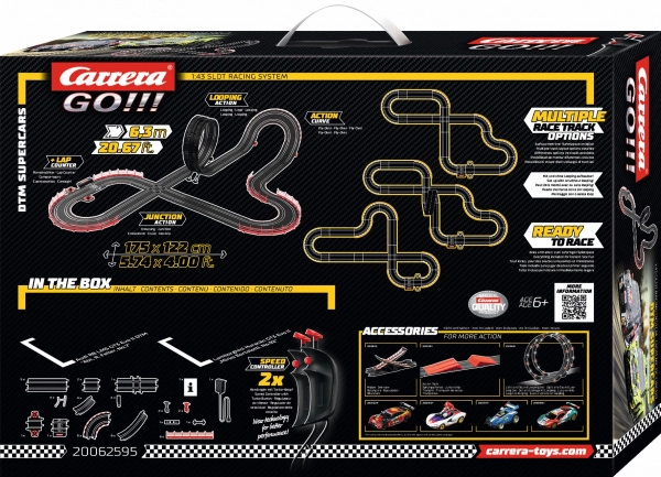 CARRERA GO bilbanen i skala 1:43 bringer adrenalinen direkte ind i stuen. Byg en bane på 6,3 m med samlede mål 175 × 122 cm og nyd dynamiske dueller mellem de ikoniske GT3-specialer Audi R8 LMS og Lamborghini Huracán. Den smarte konstruktion gør banen let at samle og skille ad og giver mange mulige konfigurationer.