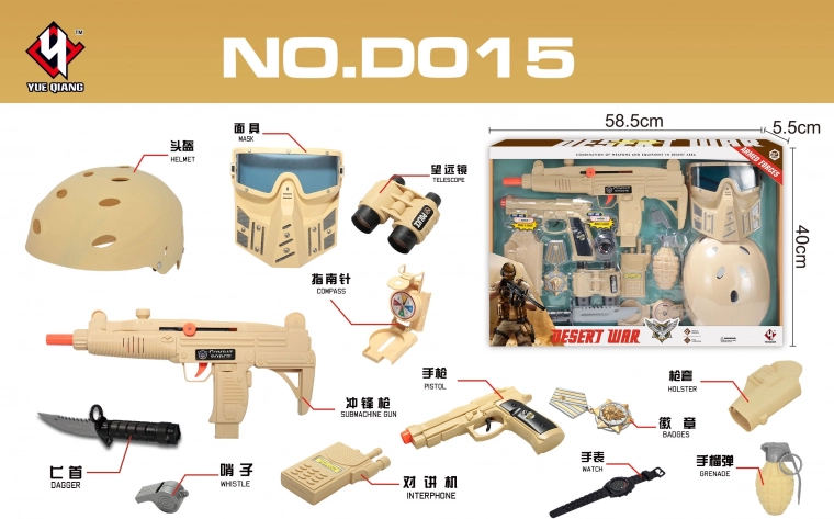 Dette sandfarvede soldatersæt vil glæde alle små eventyrere. Børn vil nyde de realistiske tilbehør, som får dem til at føle sig som på en rigtig mission – fra hjelm og vest til kompas og walkie-talkie. Riflen fungerer manuelt (når den orange ring skubbes til højre og aftrækkeren trykkes, afgives en skyde-lyd), og pistolen drives af 3× AG13 (batterier medfølger).