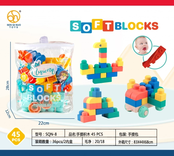 Denne farverige pakke med bløde klodser indeholder 45 dele til sikker og udviklende leg. Materialet er skånsomt for både børn og miljø, klodserne er lette, uden skarpe afslutninger og vender tilbage til deres oprindelige form efter bøjning. Nem vedligeholdelse – det er nok at skylle af eller koge dem; farverne forbliver stadig intense.
