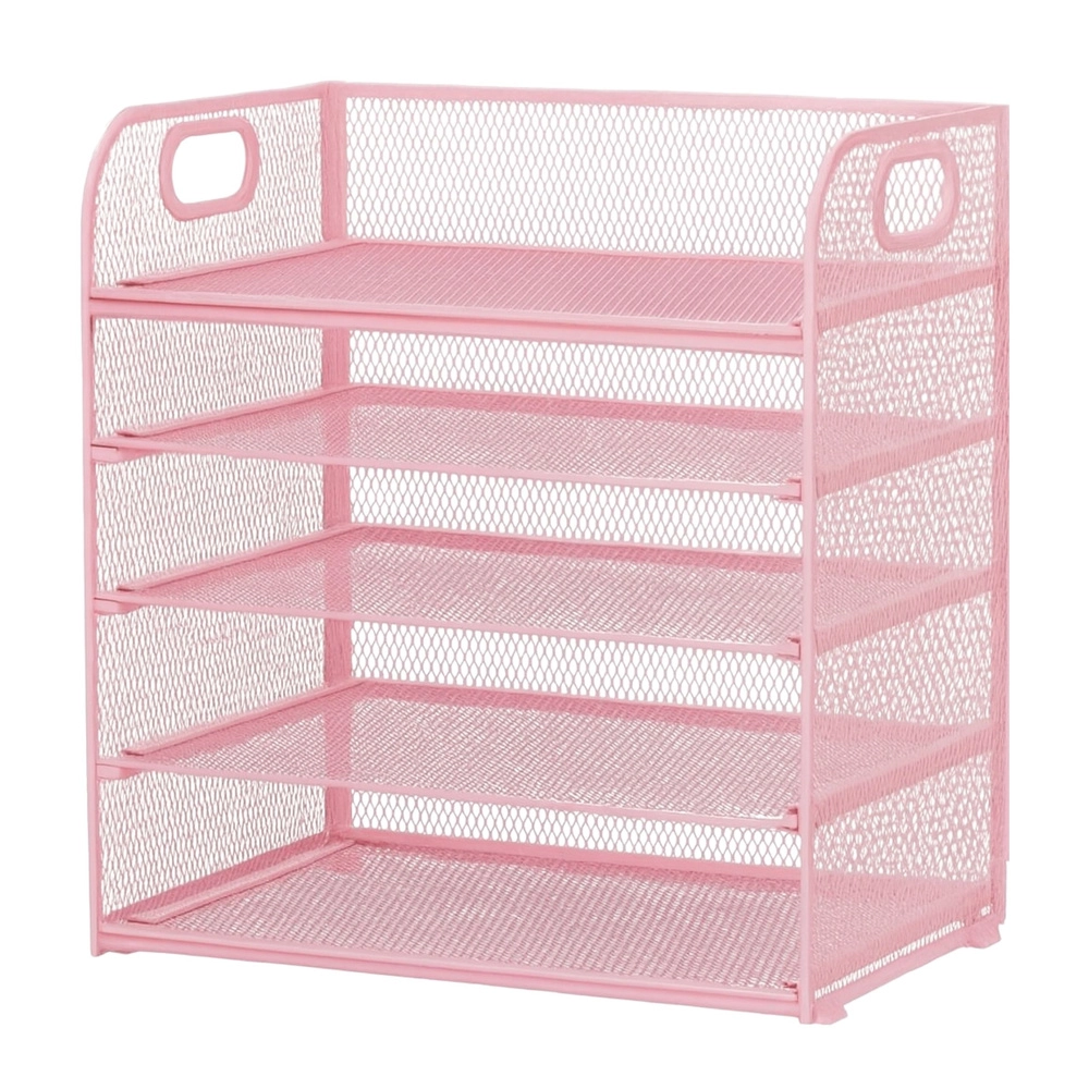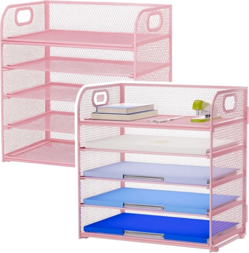 Stilfuld lyserød bordorganisator med 5 rummelige niveauer, der hjælper med at holde orden i dokumenter, hæfter og kontortilbehør. Holdbart metalnet med pulverlakering, sidehåndtag for nem transport og stabil konstruktion gør denne organisator til et ideelt valg til kontor, hjemmearbejdsplads og studieværelse.