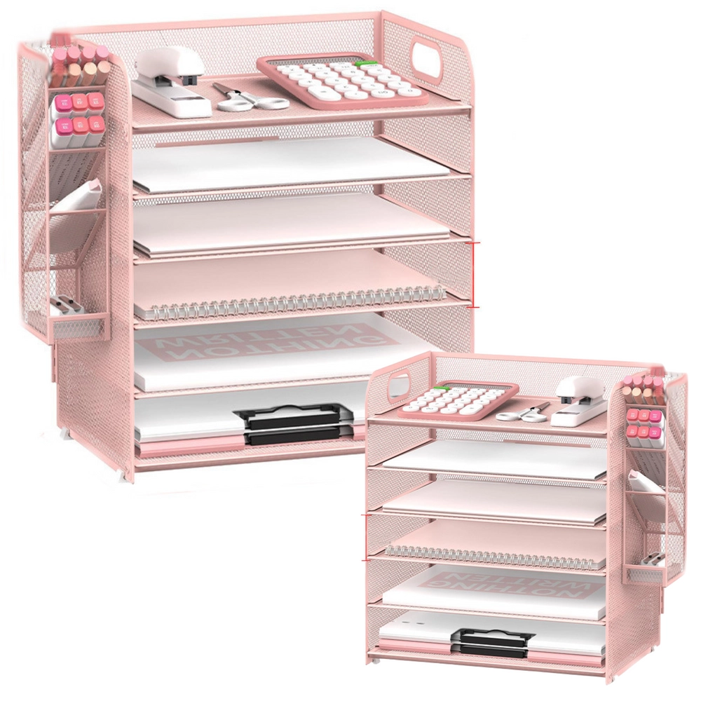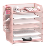 En stilfuld metalorganizer til skrivebord i lyserød, der holder din arbejdsplads overskuelig og elegant. Den tilbyder 5 rummelige rum til kontortilbehør, er fremstillet af lakeret metal med netkonstruktion for holdbarhed og stabilitet. Takket være de kompakte mål passer den på ethvert skrivebord og tilfører både orden og moderne design til indretningen.