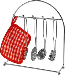 - Pande; 3 gryder i forskellige størrelser; 2 låg; 2 krus; stativ til køkkenredskaber; tekstil-bordskåner; tekstilhandske; 4 skeer; piskeris; øse; palet; si; pastaske; 2 flade sigter