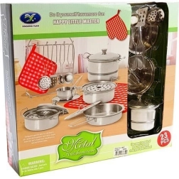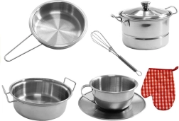 Komplet rustfrit køkkensæt til børn med 23 dele, der giver timevis af kreativ leg og læring. Indeholder pande, gryder med låg, redskaber og tekstiltilbehør – alt i metallic look, der passer til ethvert legekøkken. Understøtter finmotorik, samarbejde og udvikling af kreativitet. Velegnet fra 3 år, med CE-certifikat og i overensstemmelse med EN 71.