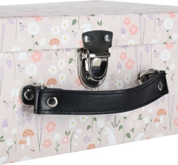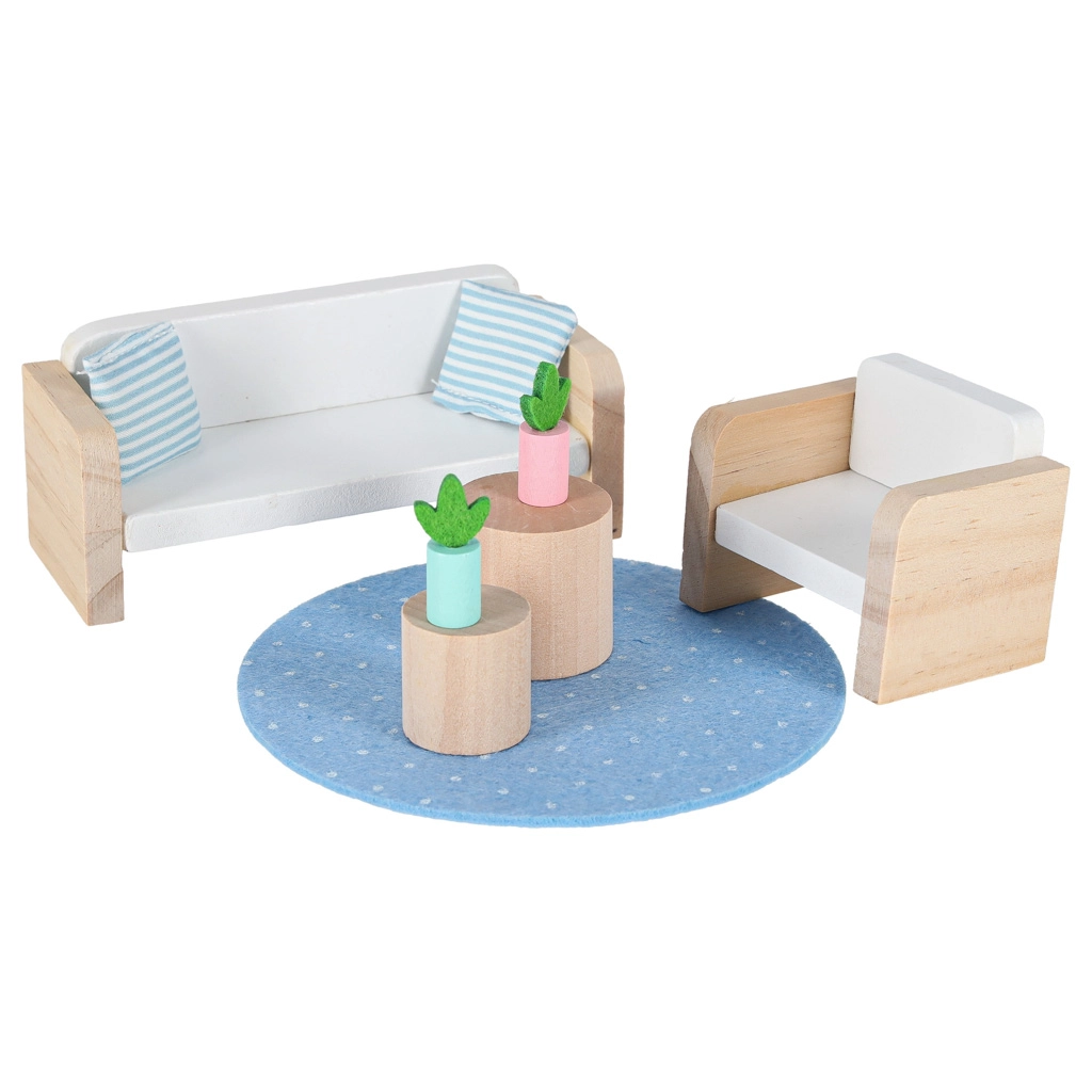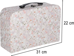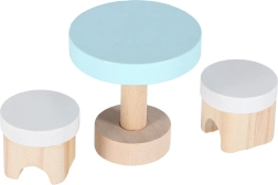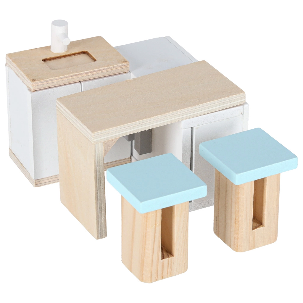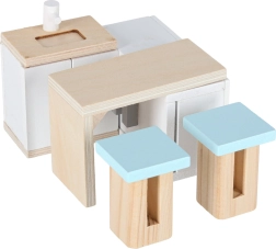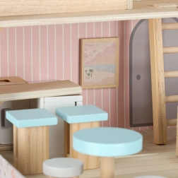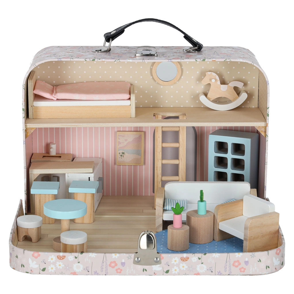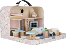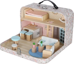 Dette mini dukkehus i kuffert forvandles ved åbning til et to-etagers interiør med køkken, stue og soveværelse. De blide pastelfarver kombineret med naturligt træ skaber en hyggelig stemning og indbyder til rolleleg med dukker eller figurer.
