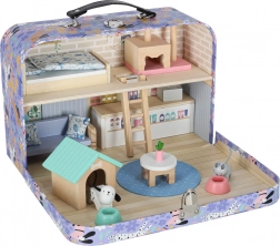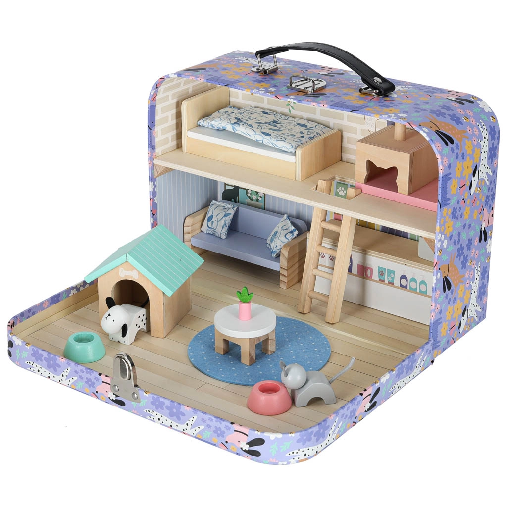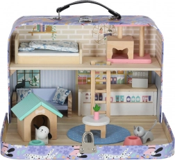 Magisk dukkehus i kuffert til dyreelskere, som byder på en toetagers mini-bolig fuld af detaljer og tilbehør. Det er let at bære takket være det praktiske håndtag, og efter leg rydder du hurtigt alting væk i kufferten, så værelset forbliver ryddeligt. Træmøbler, hund og kat med egne skåle, hundehus og kradsetræ understøtter kreative rollelege hjemme og på farten.