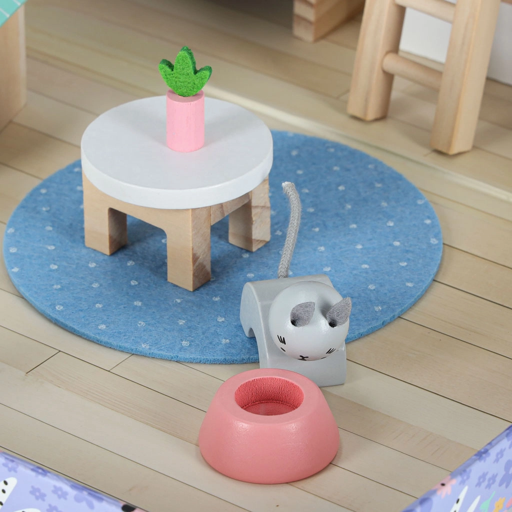 Sættet indeholder kvalitetstræmøbler (seng med sengetøj, sofa, bord, hylde, stige), elementer til en butik (disk og kasseapparat) samt et dyrehjørne med hundehus, kradsetræ til katten og to skåle. Takket være kuffertdesignet kan legetøjet nemt tages med på besøg, ferie eller legepladsen – og efter leg ryddes alt hurtigt op.