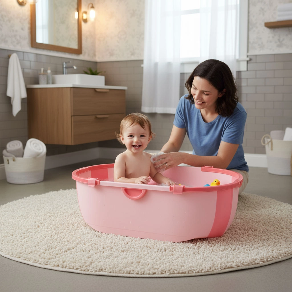 Gennemtænkte detaljer som sikkerhedslåse mod utilsigtet sammenklapning, bred, stabil base og integrerede håndtag gør det nemt at håndtere og transportere. Den glatte overflade er let at rengøre, og vandet løber hurtigt ud takket være proppen – uden at skulle vippe hele badekarret.