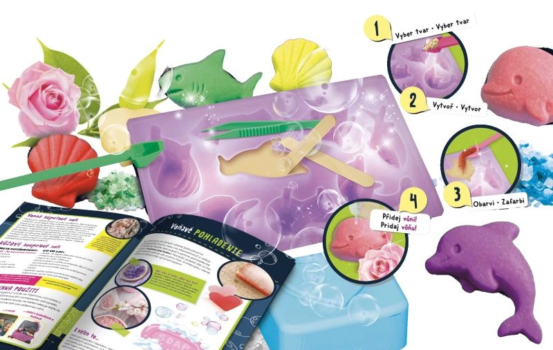 Dette sjove og lærerige sæt gør det nemt at fremstille unikke sæber med motiver af havdyr. Takket være de færdige forme og glycerinflager er processen enkel, sikker og hurtig. Tilsæt farveessens og din yndlingsduft og skab gaver eller velduftende pynt til badeværelset.