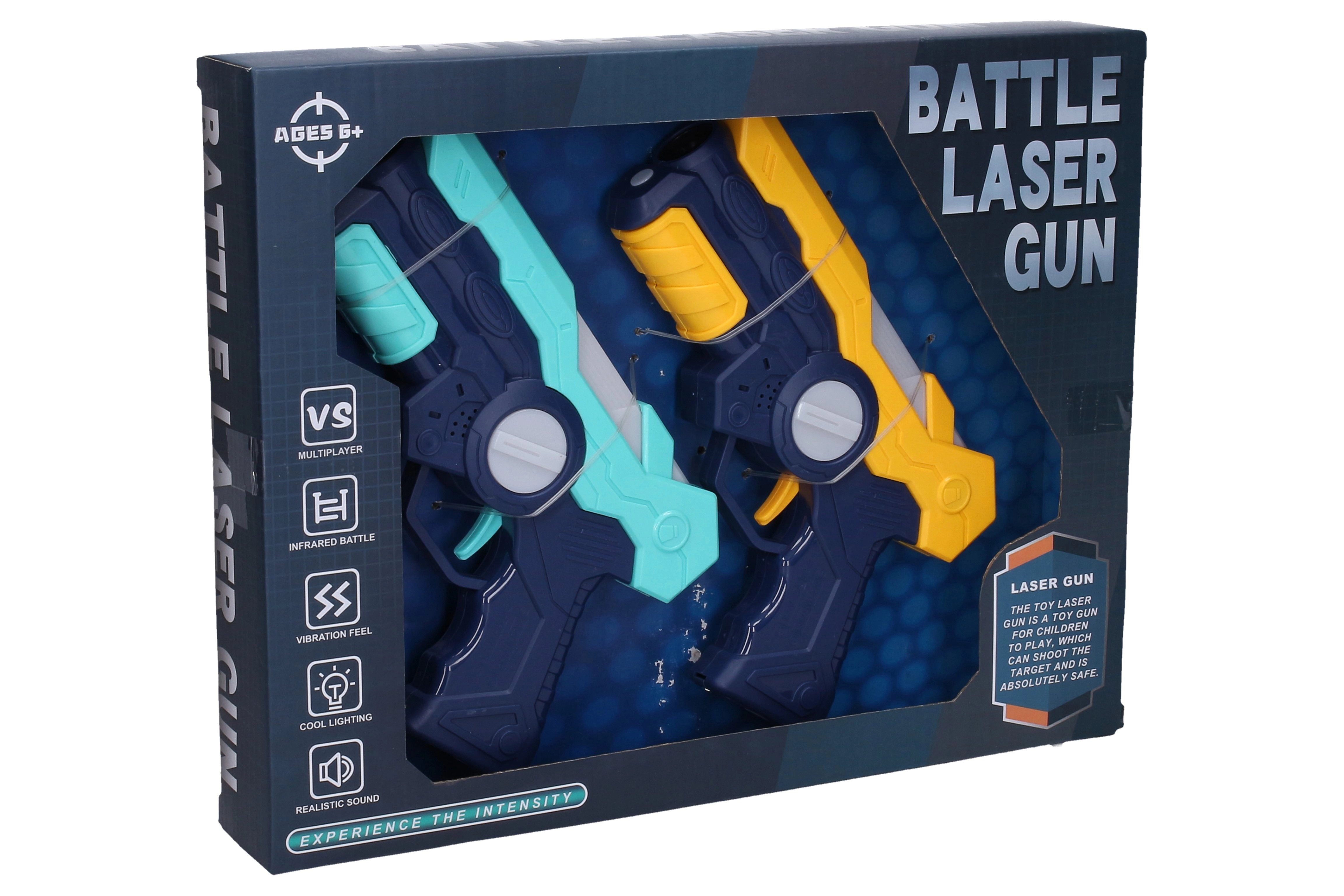 Sættet med to laserpistoler er ideelt til søskende, venner og familieopgør. Den kompakte størrelse på 20 cm ligger godt i hånden, de markante lys- og lydeffekter giver ekstra intensitet til legen, og den overskuelige billedvejledning på bagsiden af pakken guider dig hurtigt gennem opsætning og betjening.
