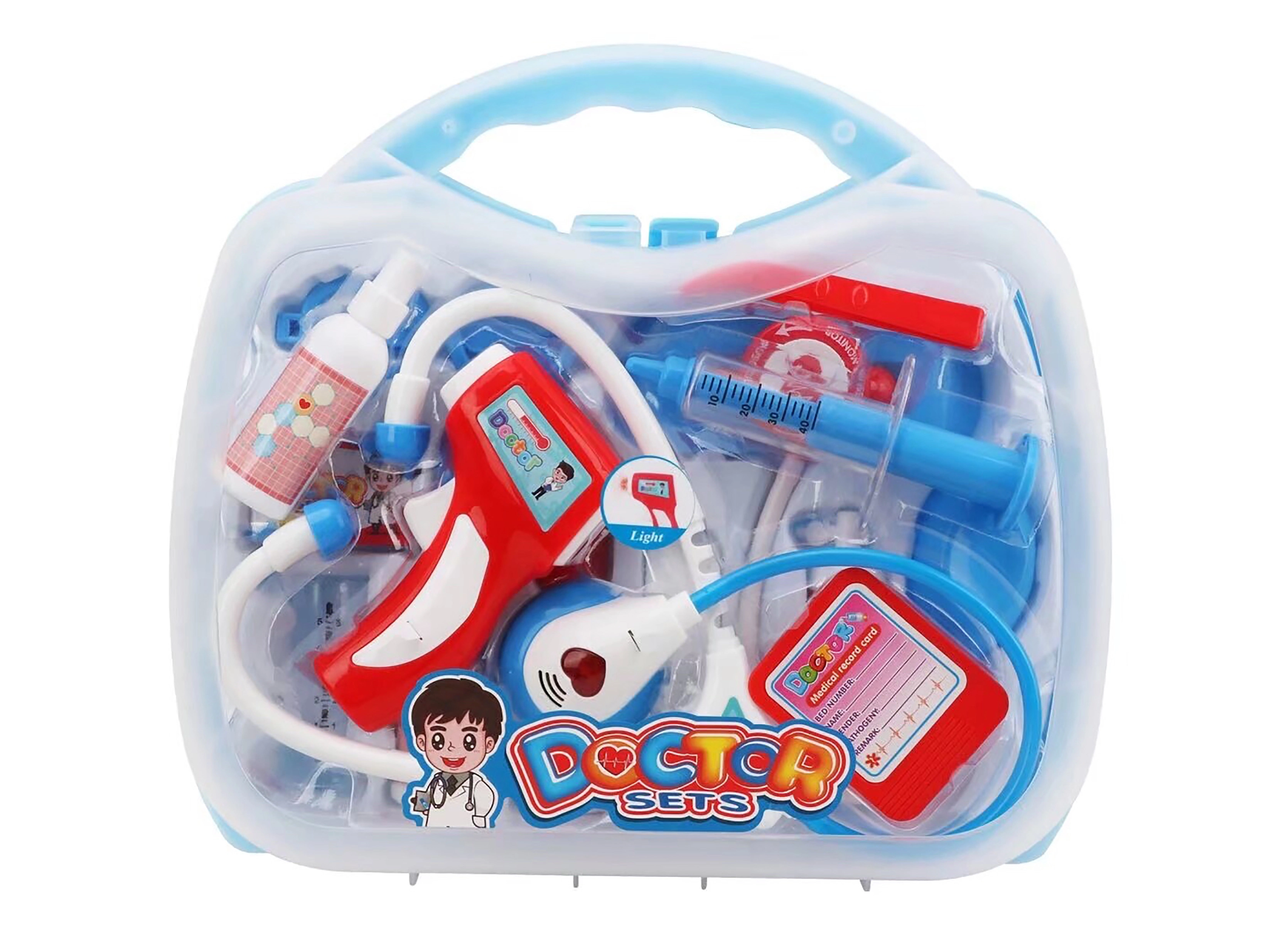 En sjov og sikker lægekuffert til børn i størrelsen 30 cm, som indeholder alt nødvendigt til rolleleg som læge: stetoskop, termometer, sprøjte, pincet og andet tilbehør. Inkluderer lyseffekter og batterier 4× AG10 for øjeblikkelig underholdning.