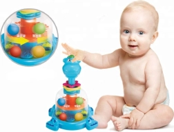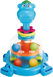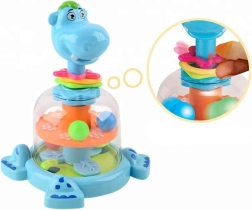 Interaktiv snurretop formet som en flodhest fanger børn fra 12 måneder med sine farver og bevægelige kugler. Ved at trykke på hovedet sættes det indre hjul i gang, og kuglerne i maven begynder at hoppe. Store, letgrebede elementer, tre skydelige former på halsen og sikre materialer med CE-certificering og overensstemmelse med EN71 understøtter finmotorik, koordination samt læring af farver og former.