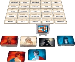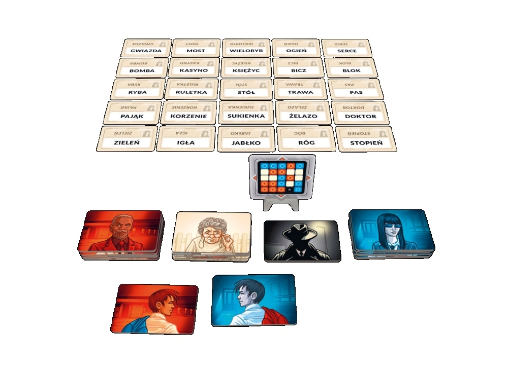 - 16 agentkort i 2 farver; 1 dobbeltagent-kort; 7 kort med uskyldige forbipasserende; 1 lejemorder-kort; 40 nøglekort; 200 kort med 400 kodenavne; spilleregler; holder