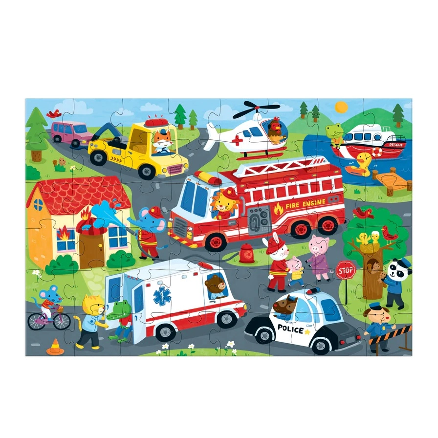 Det store gulvpuslespil MUDPUPPY Redningskøretøjer begejstrer alle små fans af sirener og action. Med 48 omhyggeligt udstansede brikker samler børnene let en scene fuld af brandmænd, politibetjente og reddere. De store brikker er lette at holde, glider ikke og hjælper med at udvikle finmotorik, koncentration og fantasi.