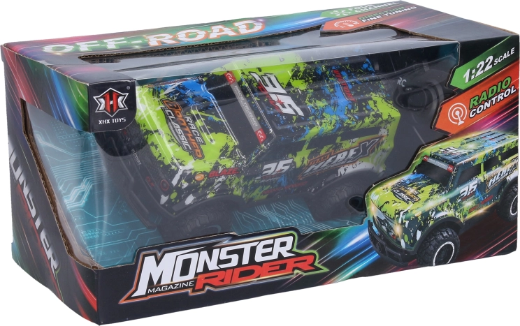 Den lysende RC-bil Monster Rider giver sjov fra første øjeblik – takket være de imponerende lyseffekter lyser den under kørsel og fanger enhver lille racerkørers opmærksomhed. De kompakte mål 17,5 × 9 × 7,6 cm sikrer fremragende manøvredygtighed og let styring, også på mindre områder.