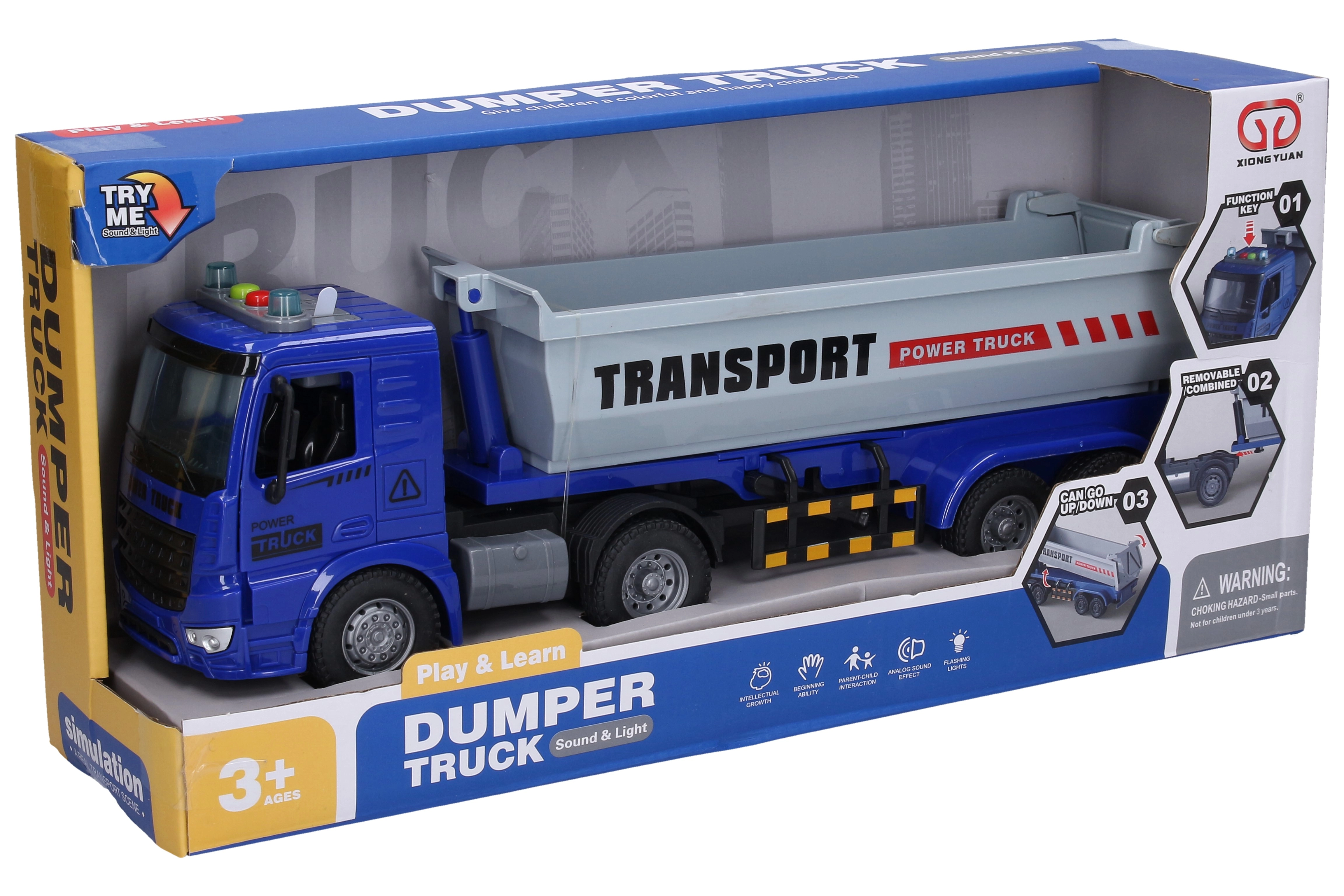 Det er nok at trykke: knap 1 starter motorlyd og tipning, knap 2 aktiverer bakkelyd og horn. Den aftagelige trailer udvider lege mulighederne – kør med eller uden trailer. Batterier medfølger, så legen kan begynde med det samme.
